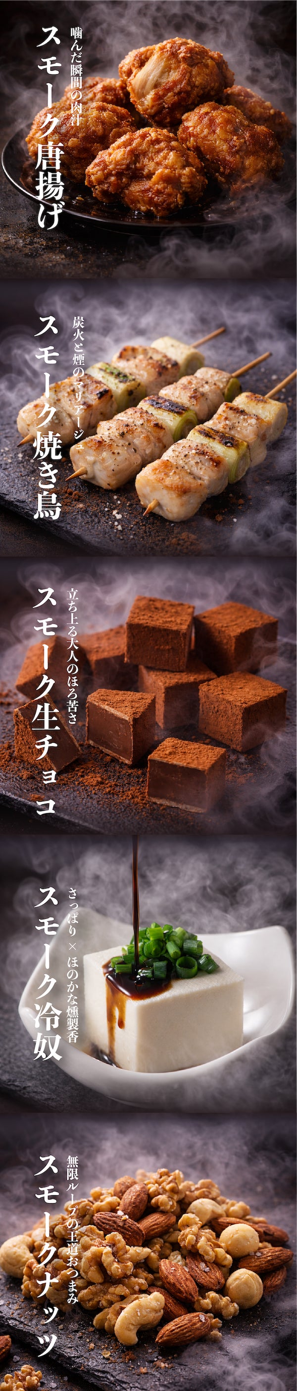 A. チーズ・ナッツ・卵・ポテチなどのおつまみから、塩や醤油などの調味料まで幅広い食材にご使用いただけます。また、ウイスキーなどのドリンクに香りを付けることも可能です。
