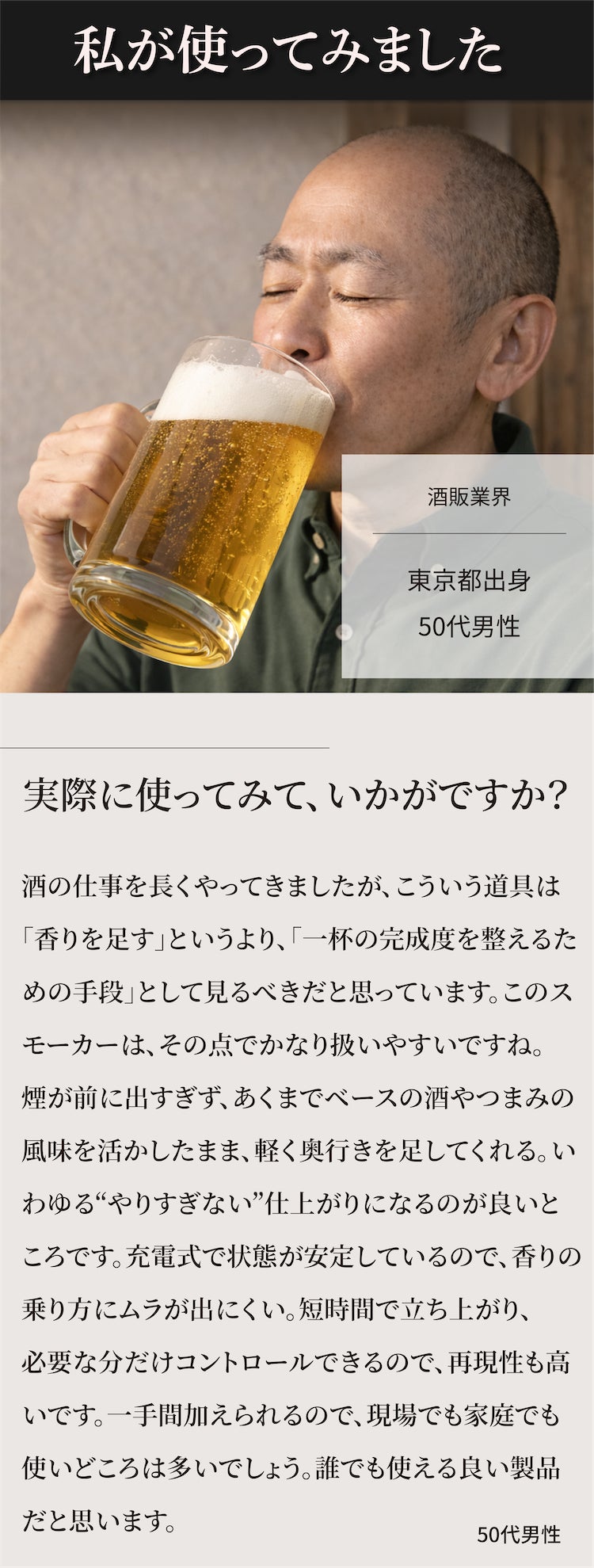 2026/04/06 20:14こんにちは!MAGIC BARRELの美希です!本日も、購入を検討されている方からよくいただくご質問にお答えします。Q:簡単に使えますか?A:はい、とても簡単にお使いいただけます!おつまみスモーカーは、チップをセットしてボタンを押すだけで燻製煙が発生するシンプルな設計となっており、初めての方でも簡単にお使いいただけます。面倒な火起こしや準備は一切不要で、手軽にスモークを楽しめるのが特徴です。また、充電式(Type-C)となっているため、電池交換の必要もなく、繰り返し何度でもご使用いただけます。ご自宅での晩酌時にさっと使ったり、ちょっとしたおつまみに香りをプラスしたりと、日常の中で気軽に燻製体験を取り入れていただけます。「燻製は手間がかかる」というイメージをお持ちの方にも、ぜひ一度お試しいただきたいアイテムです。おつまみスモーカーの詳細はこちら↓↓https://camp-fire.jp/projects/931832/view もっと見る