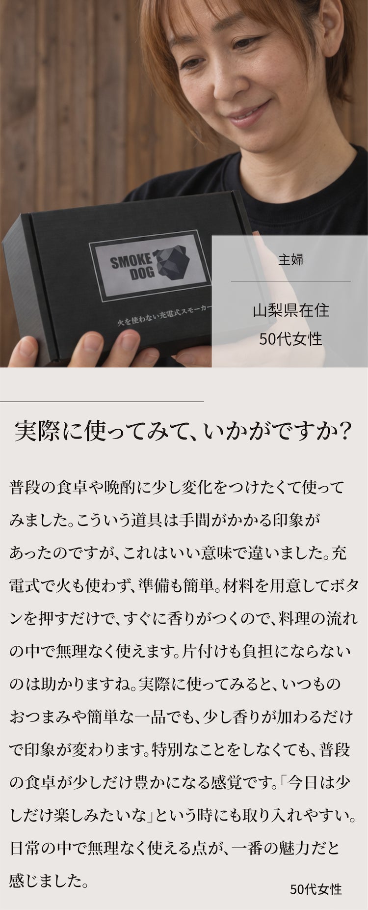 2026/04/15 18:00こんにちは!MAGIC BARRELの美希です!本日もたくさんのご支援・応援をいただき、本当にありがとうございます!引き続き、多くの方にご関心をお寄せいただき大変嬉しく思っております。そして、支援者様が1,500人を突破いたしました!たくさんのご支援をいただき、心より御礼申し上げます。本日も、購入を検討されている方からよくいただくご質問にお答えします。Q:1回の燻製時間はどれくらいですか?A:1回あたり約20秒で燻製が可能です。おつまみスモーカーは、約20秒という短時間でしっかりと煙を発生させる設計となっており、手軽に燻製の香り付けをお楽しみいただけます。短時間でもしっかり香りが付くため、「少しだけ風味をプラスしたい」といった使い方にもぴったりです。さらに、お好みに応じて燻製の回数を増やしたり、煙を閉じ込める時間を調整することで、香りの強さをコントロールすることも可能です。例えば、軽く香り付けしたい場合は1回、しっかり燻製感を出したい場合は複数回行うなど、用途に応じて自由にアレンジできます。手軽さと調整のしやすさを兼ね備えているため、初心者の方でも安心してお使いいただけます。ぜひご自身のお好みの燻製加減を見つけてみてください!おつまみスモーカーの詳細はこちら↓↓https://camp-fire.jp/projects/931832/view もっと見る