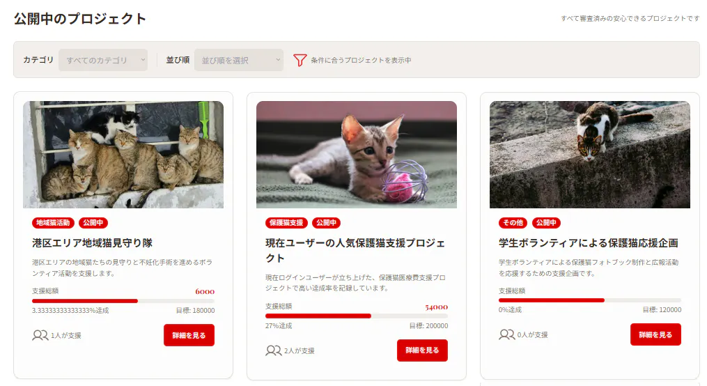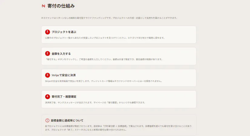 ネコファンドは、猫に特化したクラウドファンディングです。 24時間いつでも利用できるオンラインのサービスで、日本全国どこからでも、スマホやPCでアクセス可能です。保護猫活動をしている個人、地域のボランティア団体、猫カフェや保護施設の運営者、迷い猫を保護した一般の人、猫を飼っている個人など、猫のために支援を必要としている人なら誰でも受益者として利用可能です。また、猫が好きな一般ユーザー、SNSで猫アカウントを運営している人、保護活動を応援したい人、小額から寄付したい人など、猫を助けたい気持ちがある人なら誰でも支援者として参加できます。