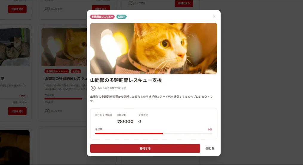 こんにちは、私たちはネコファンドと申します。私たちは動物愛護と猫の保護活動に情熱を持つチームです。このプロジェクトは、猫に特化したクラウドファンディングのサイトを立ち上げるものです。保護猫たちを新しい家族のもとへ送り出す支援や、多くの猫たちに幸せを届けるための新たな一歩を踏み出します。私たちは、猫に関する深い知識と経験を持ち、常に猫たちの福祉を第一に考えています。