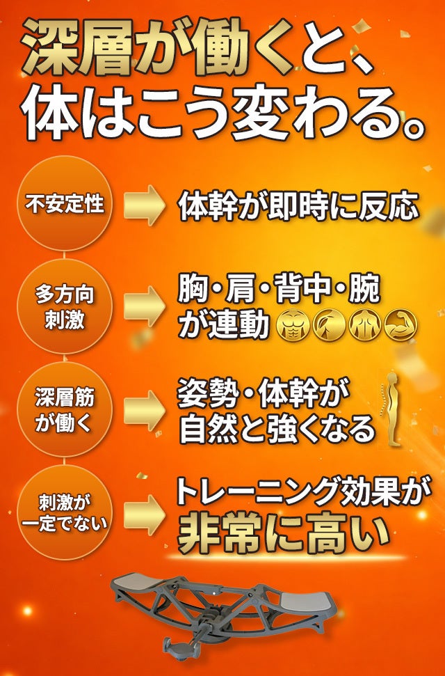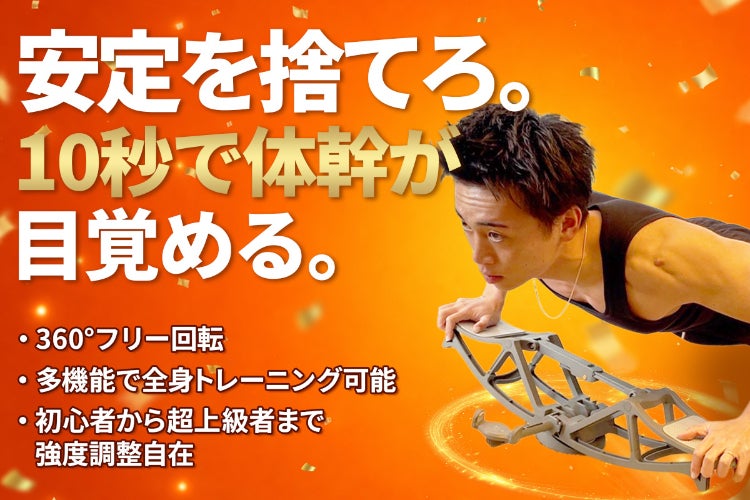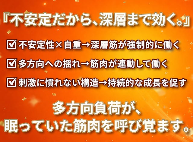 A4: 秘密は「360°フリー回転」が引き起こす多方向への揺れにあります。安定した床での筋トレは、決まった軌道で表面の筋肉ばかりを使いがちですが、本製品は姿勢を維持するために体幹が即時に反応し、深層筋(インナーマッスル)が強制的に働きます。筋肉に「慣れる」暇を与えないため、停滞期を打破する圧倒的なトレーニング効果を生み出します。
