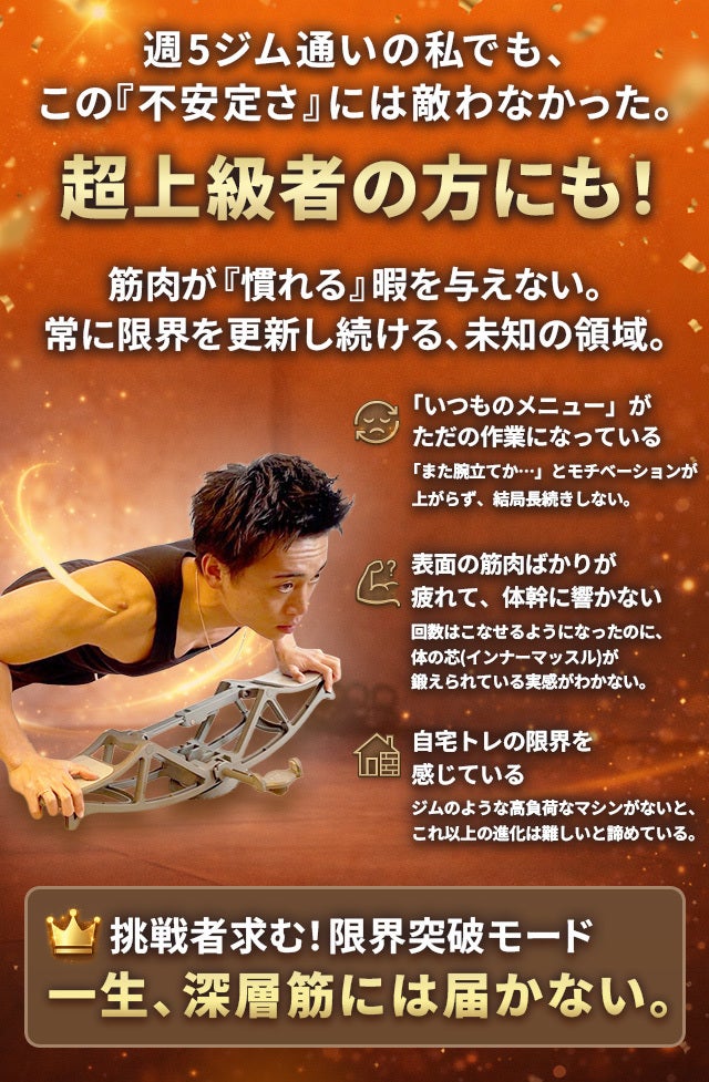 「表面の筋肉ばかりが疲れて、体幹に響かない」「重いウエイトや大型の専用マシンを家に置かずに、これ以上の進化は可能なのか」。そんな成長の停滞とマンネリに、私は長年歯がゆさを抱いてきました。アメリカで体感したような、深層筋が悲鳴を上げるほどの強烈な刺激を、なんとか自宅の限られたスペースで、自重だけで再現できないか。