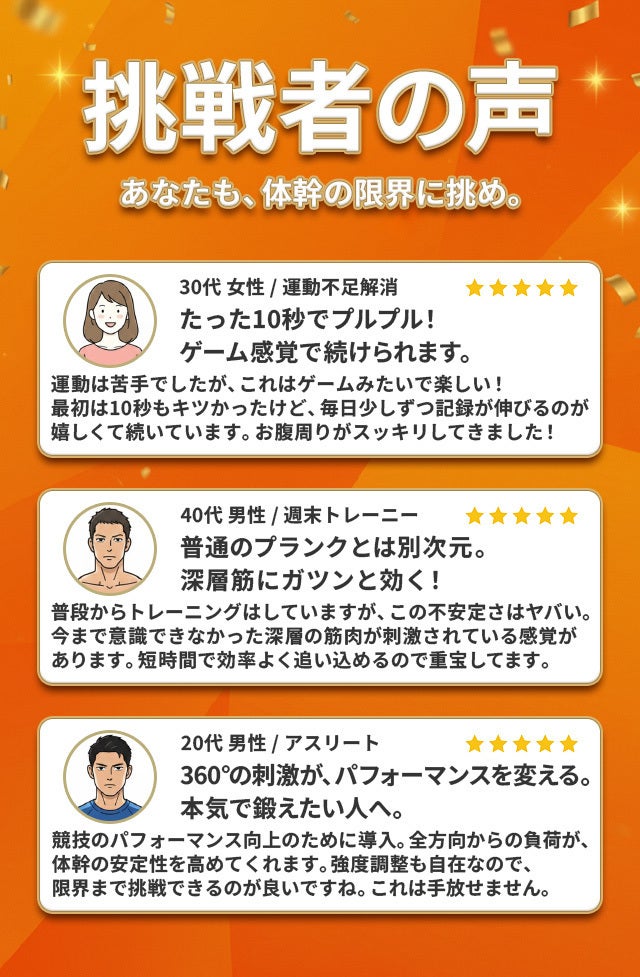 A2: はい、問題ありません。「初心者から超上級者まで強度調整自在」なのが『CORE BALANCE 360』の大きな強みです。使い始めはかつてない不安定さに驚くかもしれませんが、それがまさに「眠っていた筋肉が呼び覚まされている」証拠です。ご自宅での基礎的な体幹作りから、本格的なパンプアップまで、あなたのレベルアップに合わせて一生モノのギアとしてご愛用いただけます。