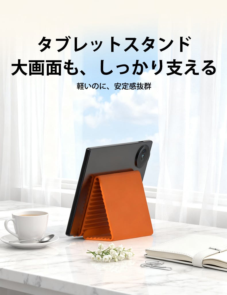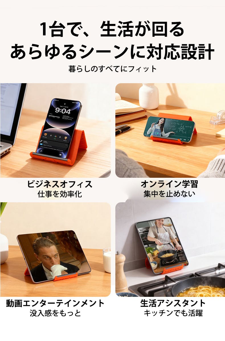 スマホ・タブレット・ノートPCまで対応する設計で、用途ごとにスタンドを買い分ける必要がありません。1枚で複数のデバイスを安定して支えられるので、使用機器が変わるたびに置き場所やスタンドを探す手間から解放されます。