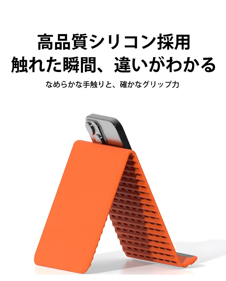 手触りの良い高品質シリコン素材を採用しています。耐摩耗性と滑りにくさを兼ね備えており、デバイスを安定して支えながら長く安心して使用できます。