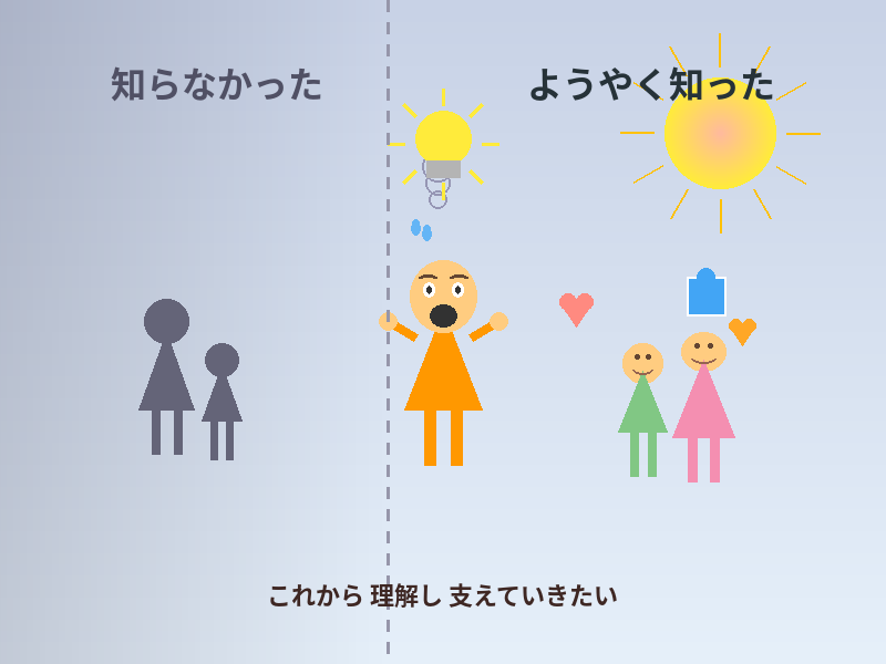 子育てもしてきましたし、長く生きてきた中で、「発達障害」「自閉症」という言葉は知っていても、「人と接することが難しい人?」といった漠然としたものでした。