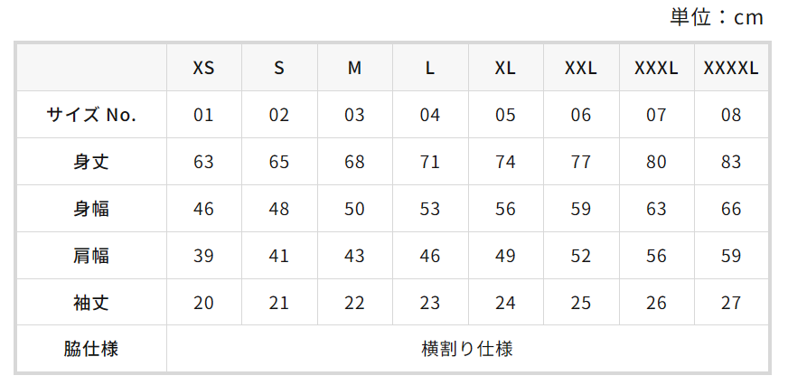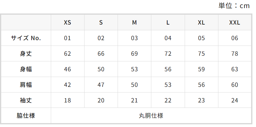 ファインジャージーTシャツ寸法表