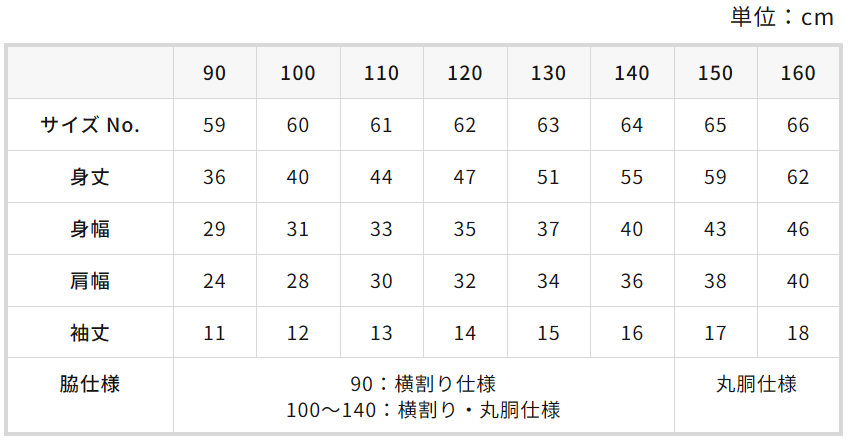 綿100%Tシャツ(キッズ)の寸法表