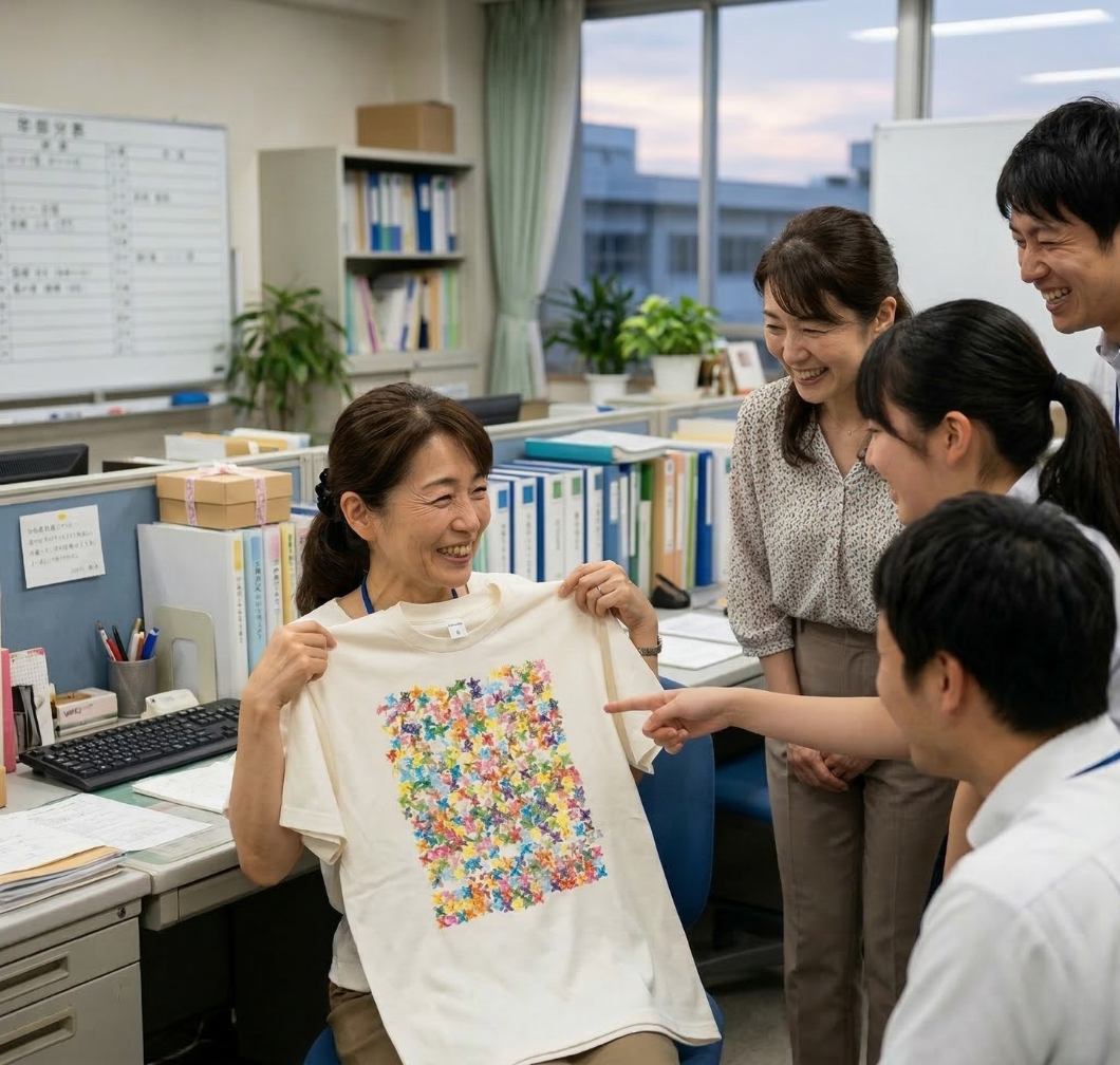 「あの折り紙が、こんなにかわいい商品になるなんて……」と、驚きと感動が混ざり合ったご様子。