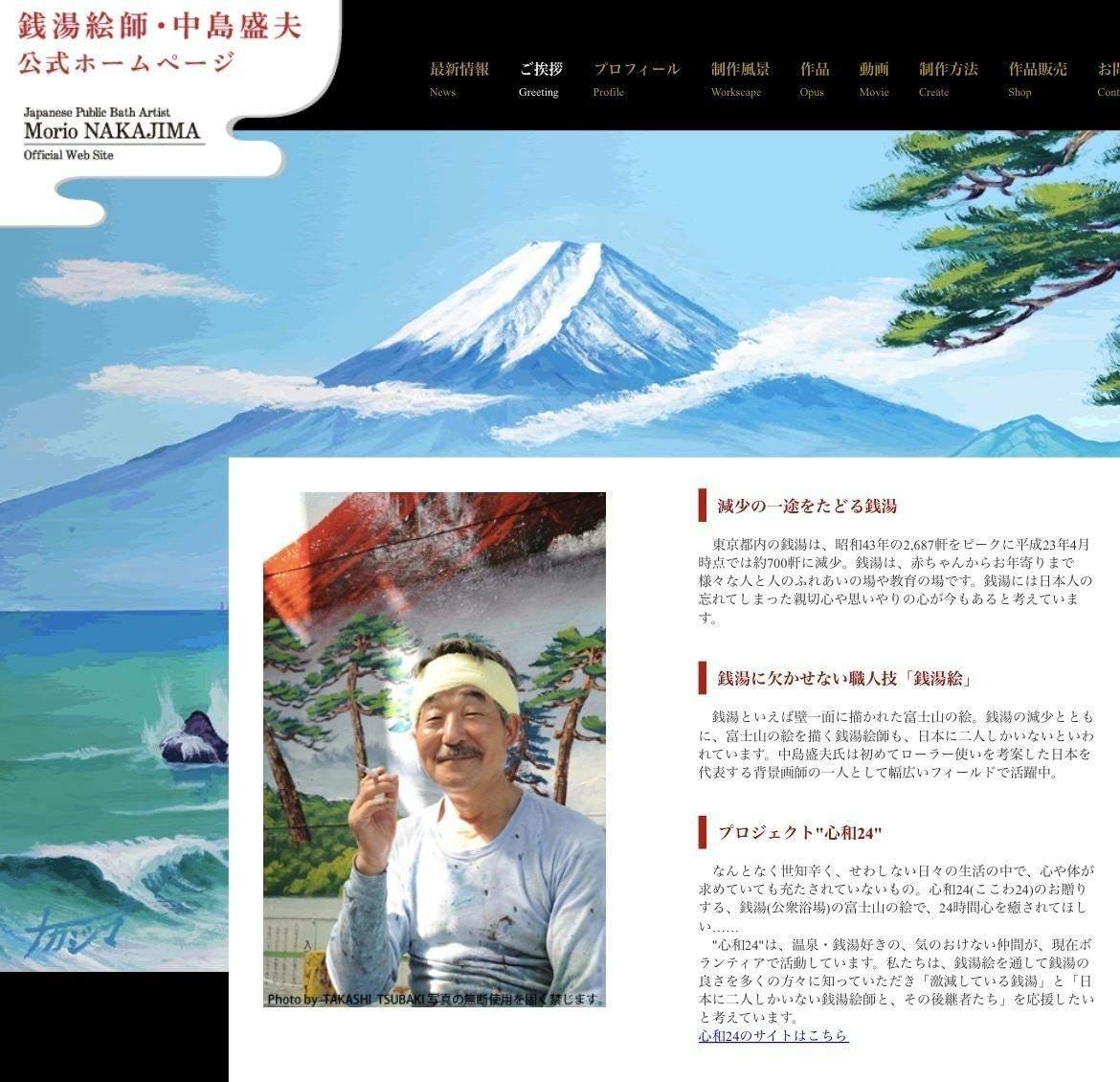 中島盛夫(なかじま・もりお)さんは、日本の伝統的な銭湯壁画(銭湯ペンキ絵)を描く職人 — 銭湯絵師として長年活躍してきた人物です。日本国内でもこの技術を持つ職人は非常に少なく、現在では全国で数人しかいない貴重な存在として知られています。