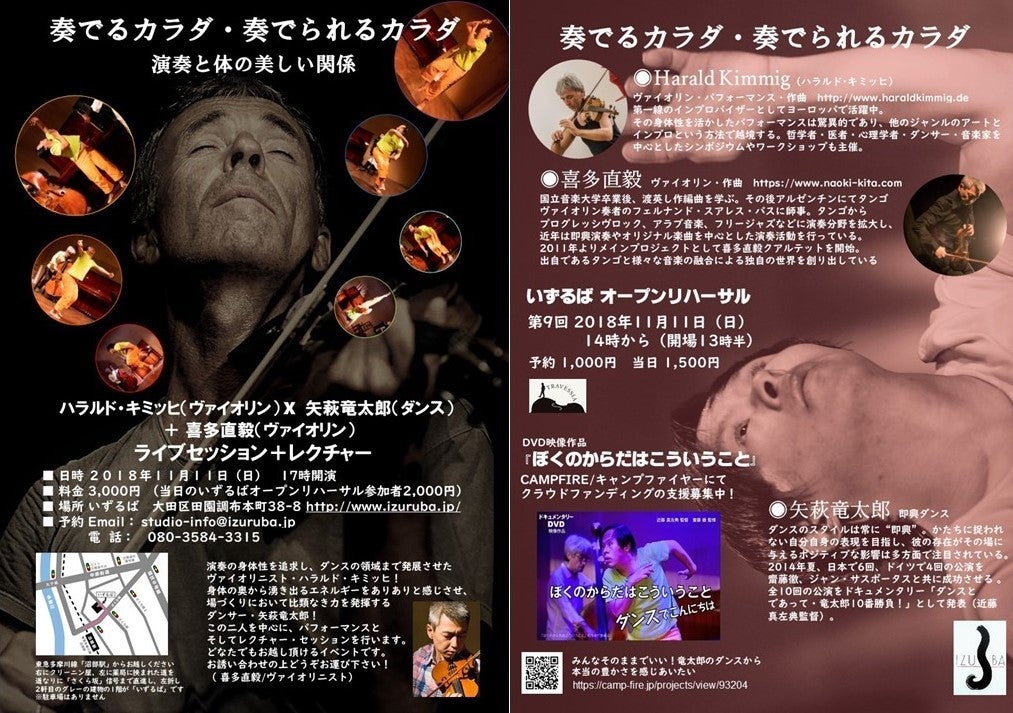 2018/10/27 10:26◆奏でるカラダ・奏でられるカラダ ☆ ライブ開催のお知らせ◆ ー 演奏と体の美しい関係 ー ハラルド・キミッヒ(ヴァイオリン) × 矢萩竜太郎(ダンス)+ 喜多直毅(ヴァイオリン/演奏家)+藤波圭介(トロンボーン) 日時 : 11月11日 17時開演 場所 : いずるば 大田区田園調布本町38-8 http://www.izuruba.jp/料金 : 3,000円 問い合わせ:080-3584-3315 喜多直毅さんが企画されたこのライブ、喜多さん自身が「誰よりも僕が観たい!」「観客で観ていたいくらい」というもの!ひとつには、喜多さんはハラルドさんの身体性の高さに注目しています。「まるで踊るように弾く…見たこともないような身体性の高さ」「ダンスしながら演奏しているわけじゃない」「演奏するカラダがそのままダンスを表現しているような…」「竜ちゃんとやったらいったいどうなるんだろ!」「彼に竜ちゃんのビデオを見せたら『ぜひやりたい』って」 みなさん、ぜひ観に来て!聴きに来て!感じに来てください! 即興についてハラルドさんのレクチャーつきです。 むらかみ もっと見る
