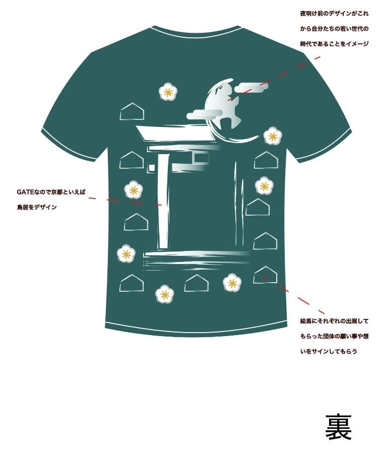 そこで「GATE」を京都の鳥居に見立て、その周りに各団体の願いや想いを書き込める絵馬を配置しました。5月10日のイベント当日、実際に絵馬やTシャツにメッセージを書いてもらうことで、このTシャツは完成します。