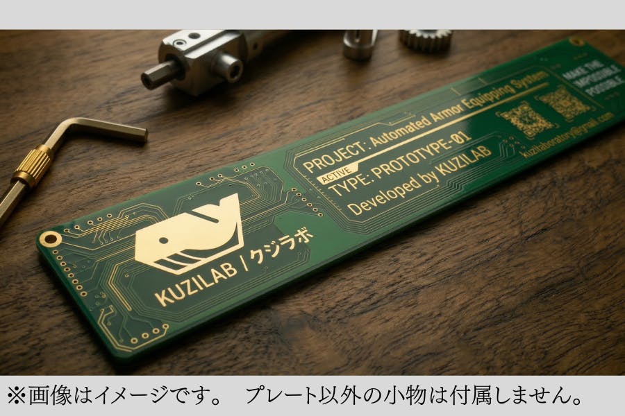本物の電子回路基板を使用し、緑のベースに金色の配線が輝く特製のプレートです。隅のビス穴をデザインしたエンブレム仕様となっており、現リターン品の基板名刺とは異なるアプローチで製作する特別なアイテムです。