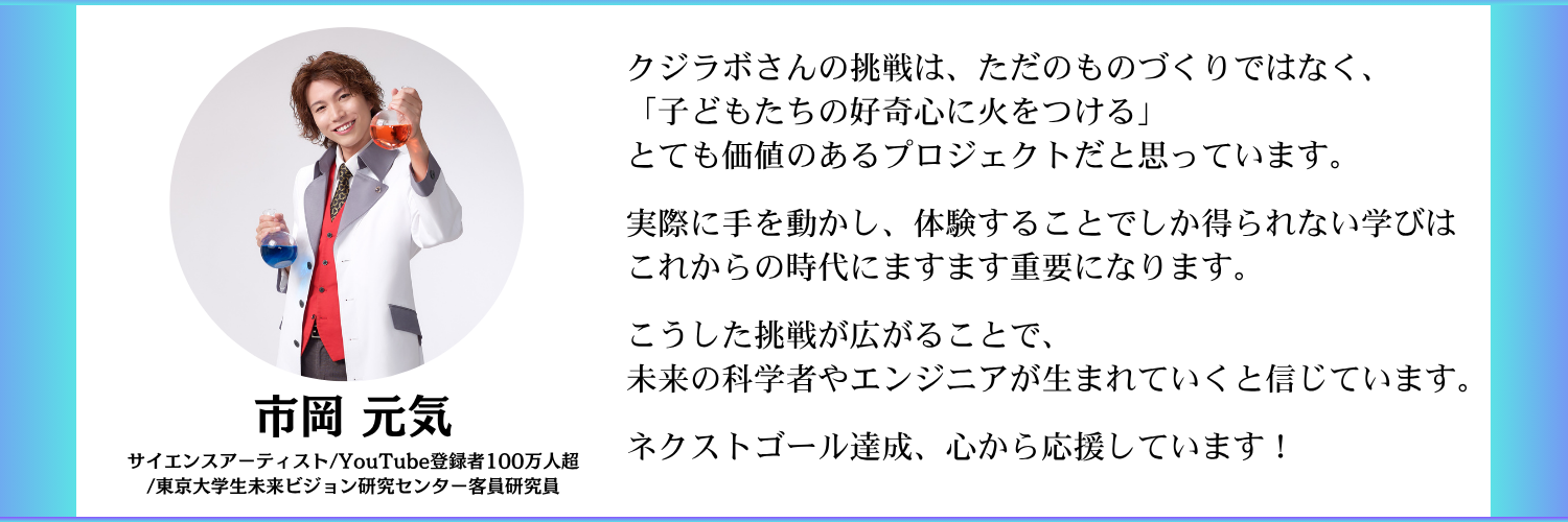 ※リターン品の発送時期について 名刺やクジラボ基板プレートなどのリターン品につきましては、予定通り【2026年11月】より順次発送予定です。動画へのお名前掲載など、本体の完成を伴う特典につきましては、装置完成時の実行となります。何卒ご理解のほどよろしくお願い申し上げます。