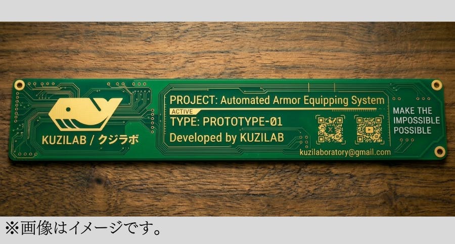 【動画にお名前掲載コース】の内容に加え、本物の電子回路基板を使用し、緑のベースに金色の配線が輝く特製のプレートをお届けします。アーマーのプロトタイプを示す印字や、四隅のビス穴をデザインしたエンブレム仕様となっており、現リターン品である「黒の基板名刺」とは異なるアプローチで製作する特別なアイテムです。