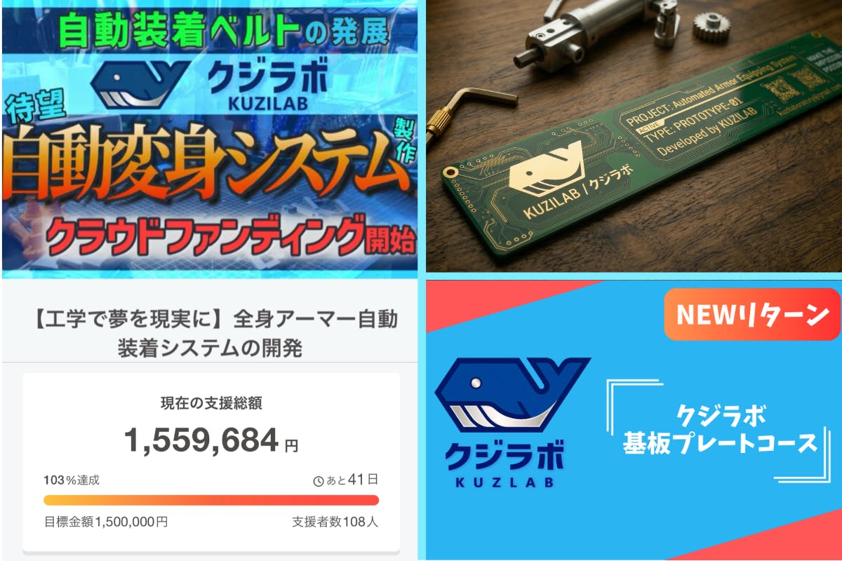 2026/03/12 19:00支援者の皆様、そしてプロジェクトをご覧いただいている皆様へ。クジラボ / KUZILABです。皆様からの多大なるご支援のおかげで、3月10日の募集開始からわずか13時間で、第一目標である150万円を達成することができました。お一人お一人からの温かいご支援とコメントに、深く感謝申し上げます。一人で進めているプロジェクトのため不安もありましたが、皆様の応援が本当に大きな励みになっております。ありがとうございます。ご期待に応えられるよう、全力で取り組んでまいります。引き続きよろしくお願いいたします。この度、プロジェクトをさらに本格的なものへと引き上げるため、【ネクストゴール:250万円】に挑戦させていただきます。■ ネクストゴールで実現したいこと追加でいただく資金は、作品のクオリティをさらに高めるための投資に全額充てさせていただきます。大型3Dプリンターの追加導入や塗装機材と塗料の導入を行い、動作だけでなく外観のグレードも上げるための費用とさせていただきます。■ 製作期間の変更についてのお願い上記の環境を整え、さらに本格的な開発を目指すにあたり、製作期間を「約1年半」へと延長させていただく決断をいたしました。 当初の予定よりもお待たせしてしまい、誠に申し訳ありません。その分、皆様のご期待に応えられる確かなクオリティのものをお届けできるよう、全力を尽くします。(※すでにご支援いただいている皆様への名刺やプレートなどのリターン品につきましては、予定通り2026年11月より順次発送を進めてまいります。動画への掲載等、本体の完成を伴う特典については、装置完成時となります。)■ 新リターン「クジラボ基板プレート」の追加ネクストゴール挑戦に伴い、新しいリターン品【クジラボ電子基板プレートコース(13,000円)】を追加いたしました。本物の電子回路基板を使用し、緑のベースに金色の配線が輝く特製のプレートです。隅のビス穴をデザインしたエンブレム仕様となっており、現リターン品の基板名刺とは異なるアプローチで製作する特別なアイテムです。装置の完成に向けて、引き続き開発にしっかりと取り組んでまいります。まずは取り急ぎ、目標達成の御礼とネクストゴールのご報告とさせていただきます。夢の装置の完成まで、どうか引き続き、クジラボの挑戦を見守っていただければ幸いです。よろしくお願いいたします! もっと見る