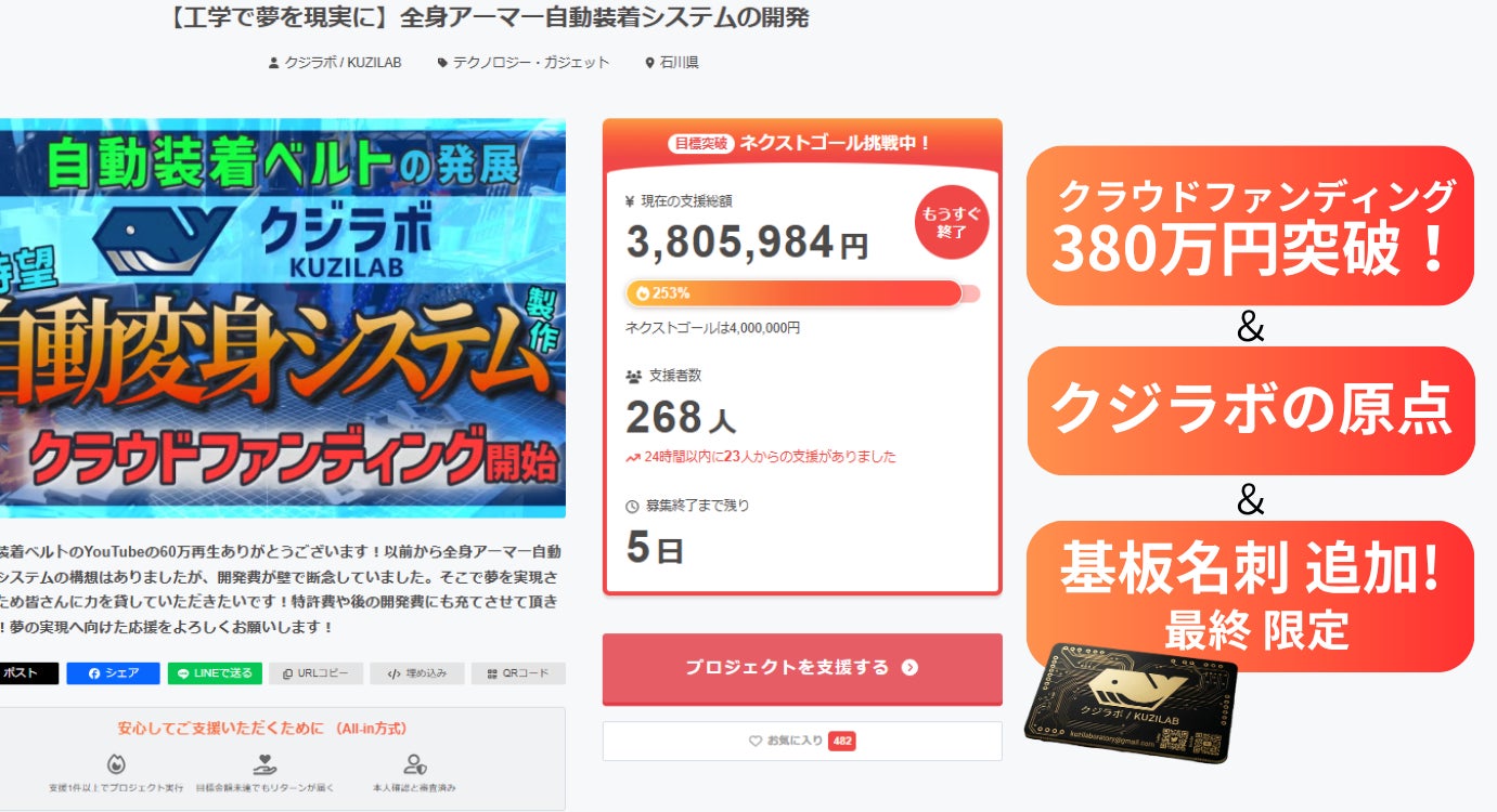 2026/04/16 12:00クラウドファンディングもいよいよ残り5日となりました。皆様のおかげで、ご支援総額380万円を達成いたしました!本当にありがとうございます!本日は、あらためてこの「クジラボ」の成り立ちと、私の根底にある想いについてお話しさせてください。私は幼い頃からモノづくりが大好きでした。「こんなのがあったらいいな」という空想を形にするために、小学生の頃から自分なりにものづくりを続けてきました。そんな私が「クジラボ」を立ち上げたのは、この「ものづくりの魅力」をより多くの方に伝えるためです。自動装着式ベルトの開発を始め、私の活動の原点には常に子供のころからの『憧れ』があります。空を飛ぶ飛行機から、遠く離れていても会話ができる電話まで。かつて魔法のように思われていたことを現実にしてくれたのが、科学や工学でした。そして今度は私が、子供のころにワクワクした特撮や映画の中で描かれているようなギミックやエフェクトを、現実世界で可能にして見せたい。そんな想いがあふれ、2年前から本格的にこの「全身アーマー自動装着システム」の構想を練り始めました。「空想を空想で終わらせない。」工学、科学の力で、あの頃のワクワクを現実にしたいと本気で思っています。最後に一つお知らせです。完売後も多数のお問い合わせをいただいておりましたリターン品『黒の基板名刺』ですが、資材の再調整を行い、最終ロットとして限定40個を追加いたしました。小ロットでの追加発注となるため、前回よりも価格が上がってしまい大変恐縮ですが、こちらが正真正銘、最後の受付となります。残り5日。皆様と一緒に最後まで駆け抜けますので、引き続きよろしくお願いいたします! もっと見る