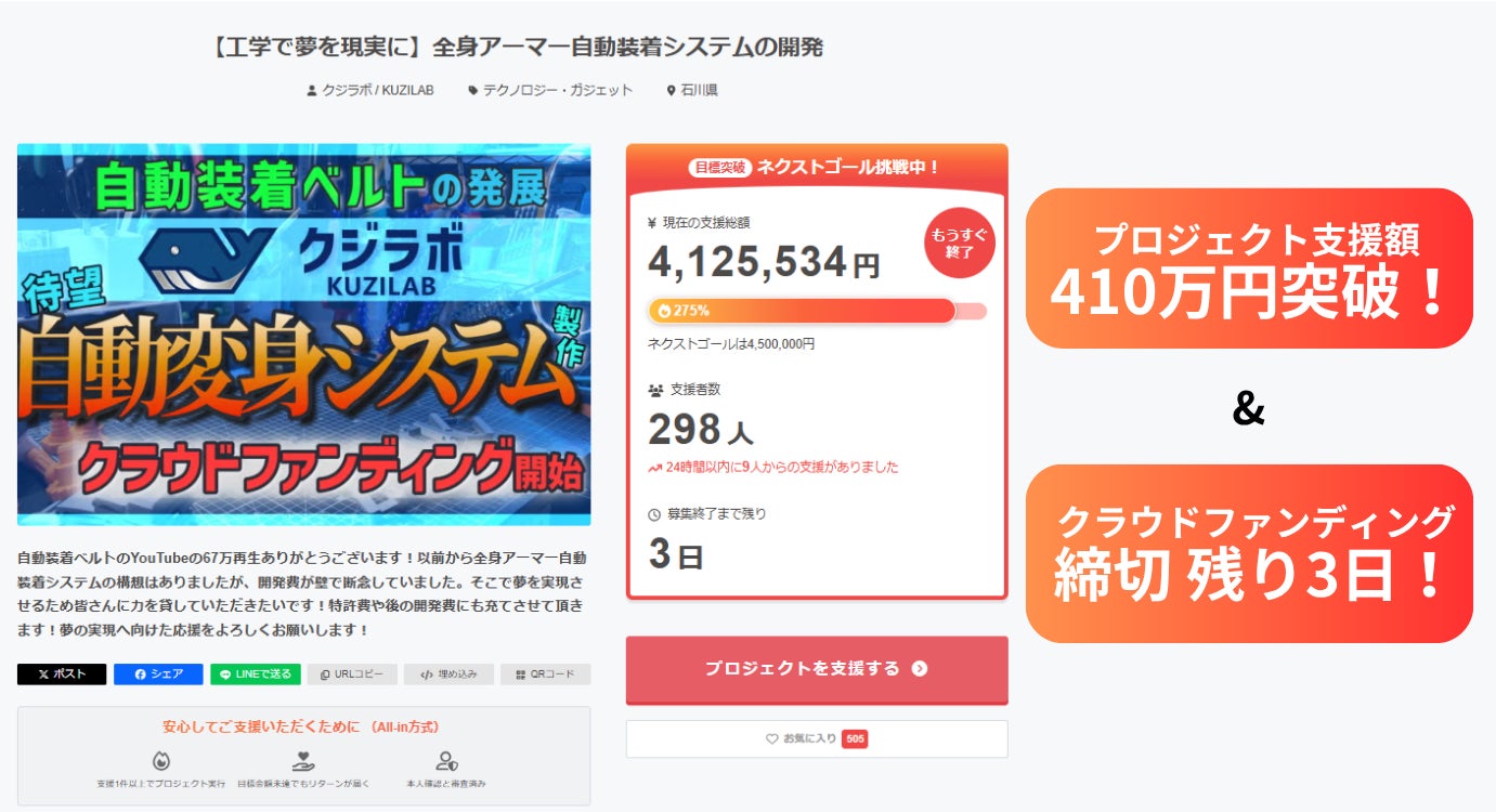 2026/04/16 12:00クラウドファンディングもいよいよ残り5日となりました。皆様のおかげで、ご支援総額380万円を達成いたしました!本当にありがとうございます!本日は、あらためてこの「クジラボ」の成り立ちと、私の根底にある想いについてお話しさせてください。私は幼い頃からモノづくりが大好きでした。「こんなのがあったらいいな」という空想を形にするために、小学生の頃から自分なりにものづくりを続けてきました。そんな私が「クジラボ」を立ち上げたのは、この「ものづくりの魅力」をより多くの方に伝えるためです。自動装着式ベルトの開発を始め、私の活動の原点には常に子供のころからの『憧れ』があります。空を飛ぶ飛行機から、遠く離れていても会話ができる電話まで。かつて魔法のように思われていたことを現実にしてくれたのが、科学や工学でした。そして今度は私が、子供のころにワクワクした特撮や映画の中で描かれているようなギミックやエフェクトを、現実世界で可能にして見せたい。そんな想いがあふれ、2年前から本格的にこの「全身アーマー自動装着システム」の構想を練り始めました。「空想を空想で終わらせない。」工学、科学の力で、あの頃のワクワクを現実にしたいと本気で思っています。最後に一つお知らせです。完売後も多数のお問い合わせをいただいておりましたリターン品『黒の基板名刺』ですが、資材の再調整を行い、最終ロットとして限定40個を追加いたしました。小ロットでの追加発注となるため、前回よりも価格が上がってしまい大変恐縮ですが、こちらが正真正銘、最後の受付となります。残り5日。皆様と一緒に最後まで駆け抜けますので、引き続きよろしくお願いいたします! もっと見る