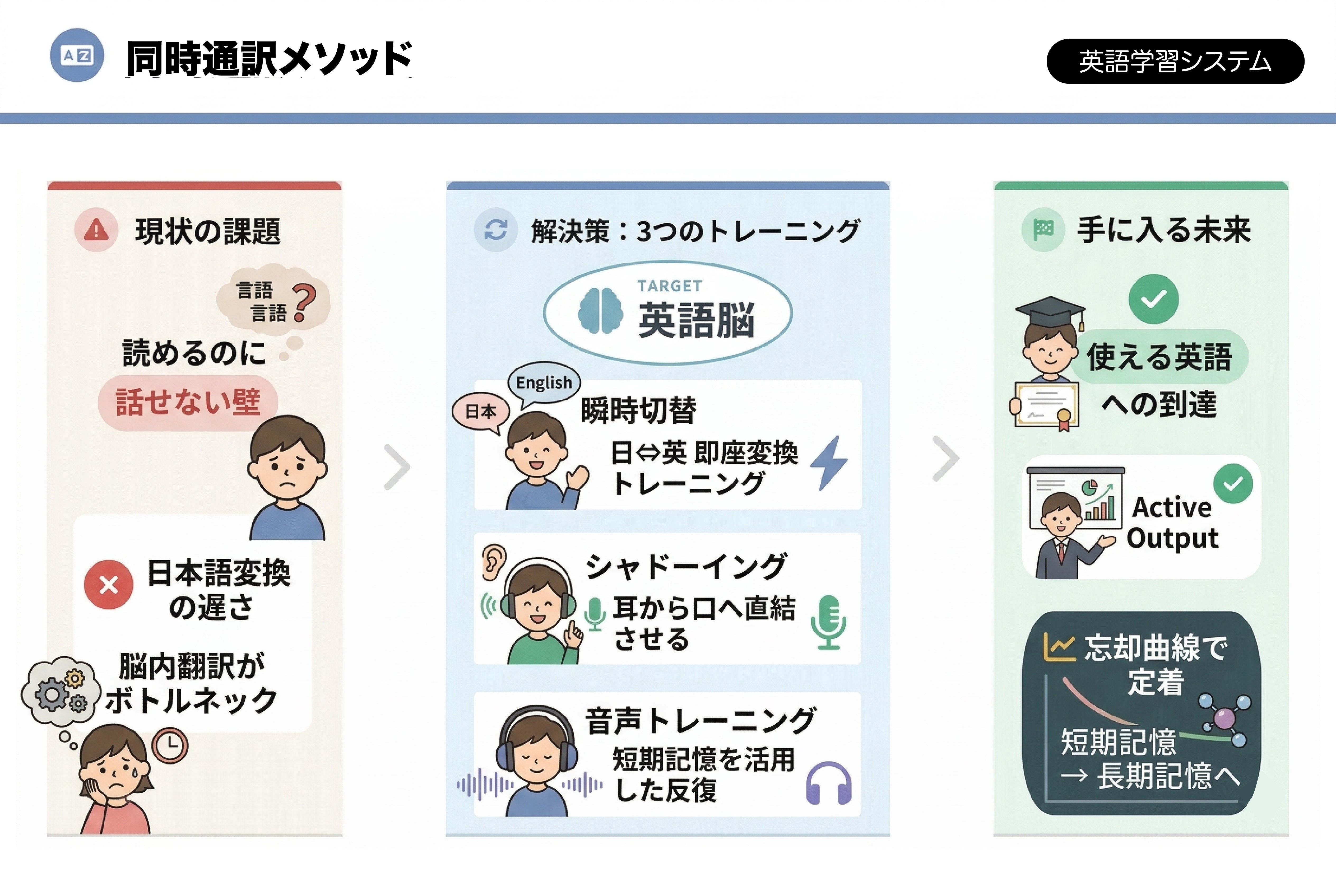 40年以上研究されてきた同時通訳トレーニングの学習法と、毎日増え続ける動画教材を活用しながら、子どもたちが毎日英語を口にする環境を「仕組み」として届ける挑戦です。