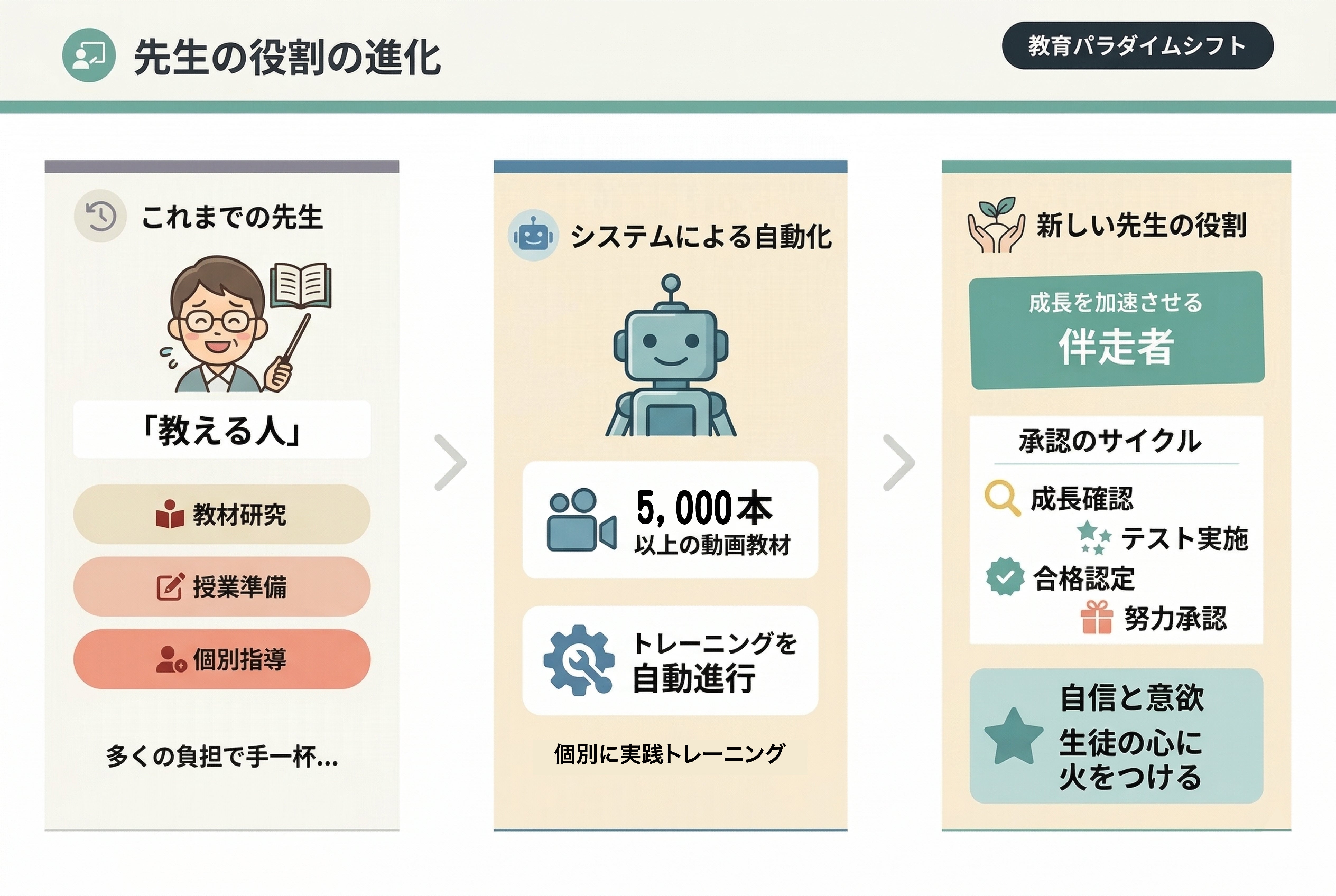 先生の熱意だけに頼る教育ではなく、自然に「話す力」が積み上がる仕組みへ。