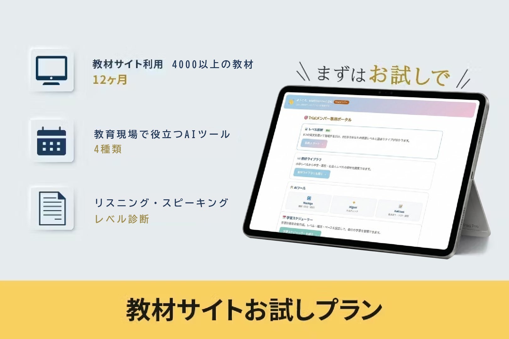 ■ 生徒用 無償利用ライセンス付与:申告された指導生徒数分の教材利用ライセンスを無償で付与いたします。生徒がアクセスできる専用教材ページを提供します。