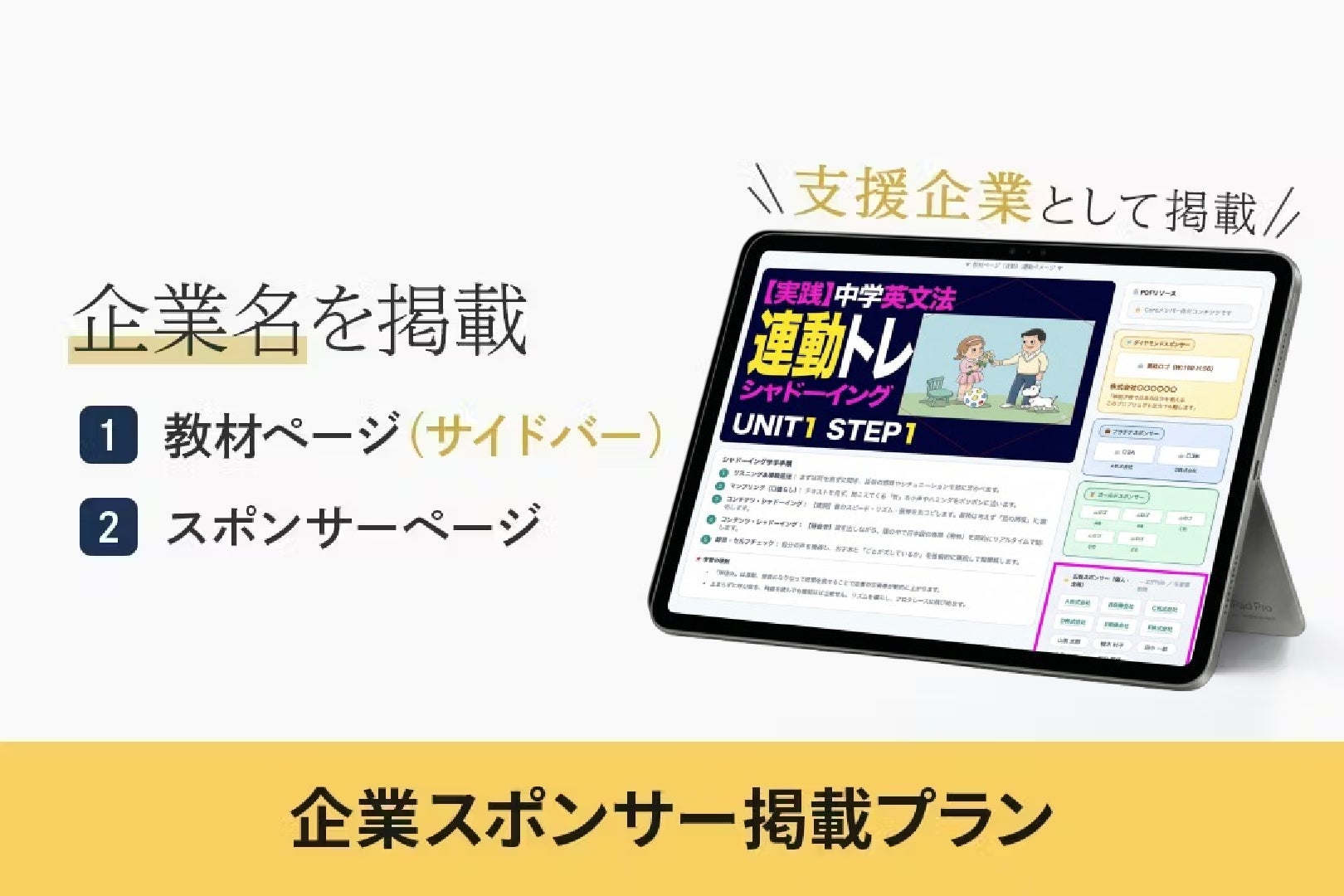 日々、英語トレーニングに取り組む生徒や先生が利用する教材ページに、企業スポンサーとして会社名を掲載いたします。