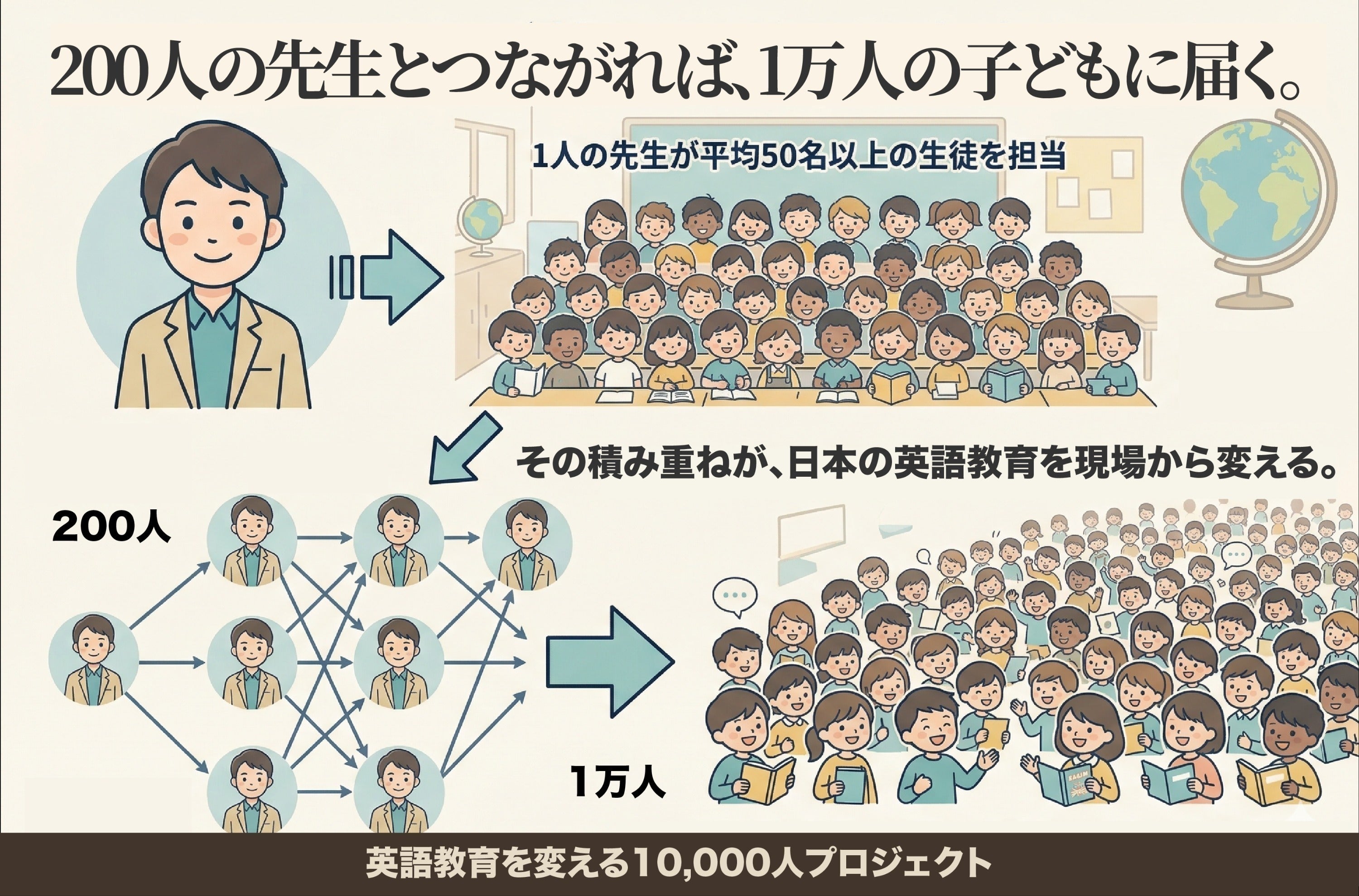 もし200名の先生がこの取り組みに参加し、それぞれが50名の生徒を支えたなら。
