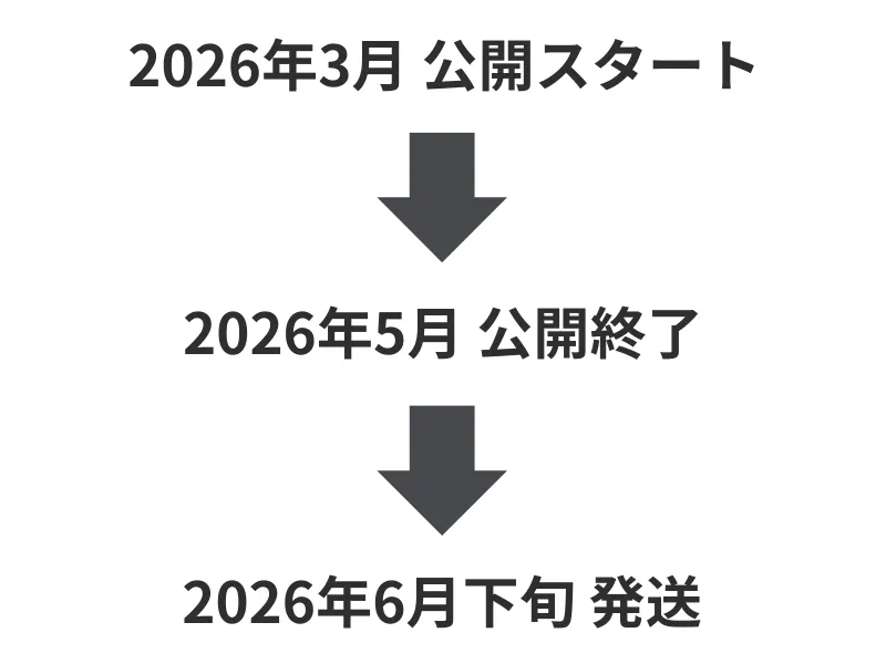 プロジェクト公開後の発送・お届けとなりますので、2026年6月下旬発送を予定しています。