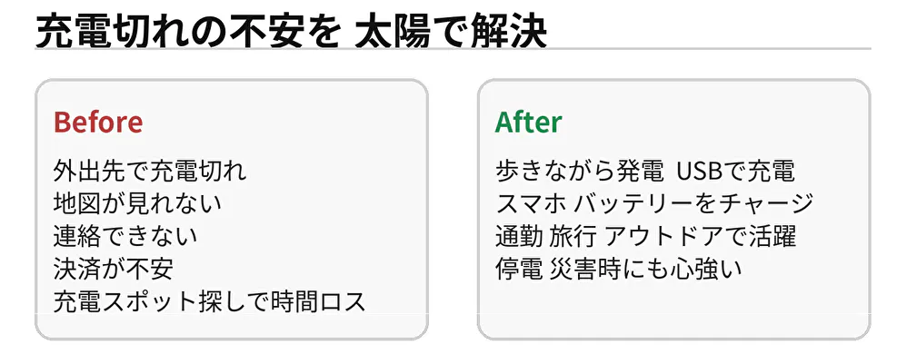 通勤や通学・ハイキング中でも、バッテリー切れの心配はもうありません。