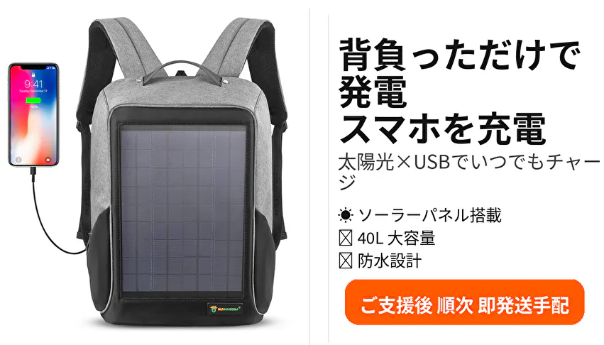 2026/03/17 18:40地図 決済 連絡 情報収集 いまスマホは生活の命綱 だからこそ充電切れは大きなリスクです ソーラーバックパックは背負って太陽光を受けるだけで発電し USBでスマホやバッテリーを充電できます 40L大容量で毎日の荷物も一括収納 防水設計で雨にも強いのが安心ご支援で充電の不安を手放してください もっと見る