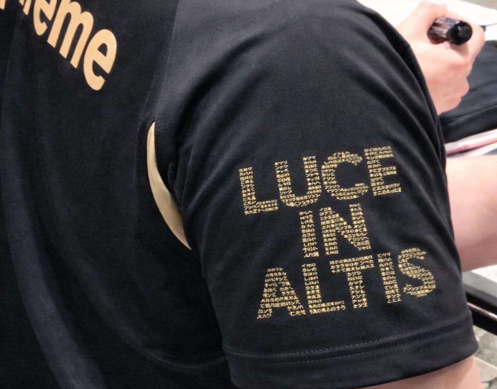 ユニフォーム袖部にデザインされているチームスローガン「LUCE IN ALTIS」に、ご支援者様のお名前を組み込んでデザインします。