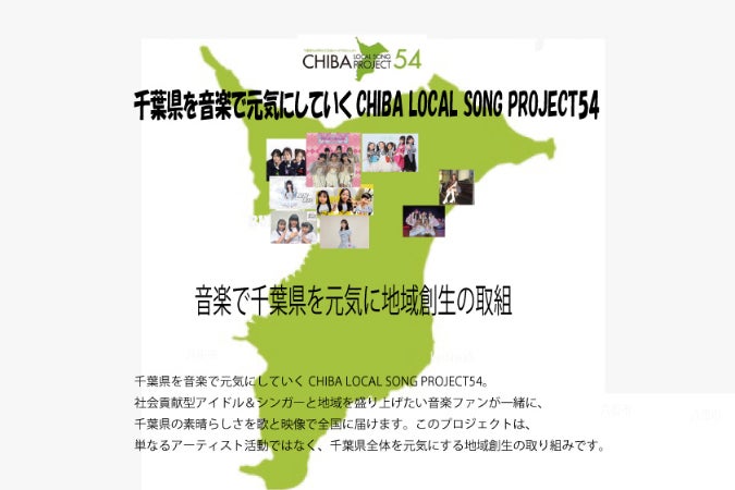 千葉県を音楽で元気にしていくCHIBA LOCAL SONG PROJECT54。社会貢献型アイドルとシンガーと地域を盛り上げたい音楽ファンが一緒に、千葉県の素晴らしさを歌とPR活動、映像で全国に届けます。プロジェクトとしてテーマ曲「千の夢」制作、プロジェクト全メンバーでのステージ開催、選抜チーム結成など次のステージに向けて活動してます。このプロジェクトは、単なるアーティスト活動ではなく、千葉県全体を元気にする地域創生の取り組みです。