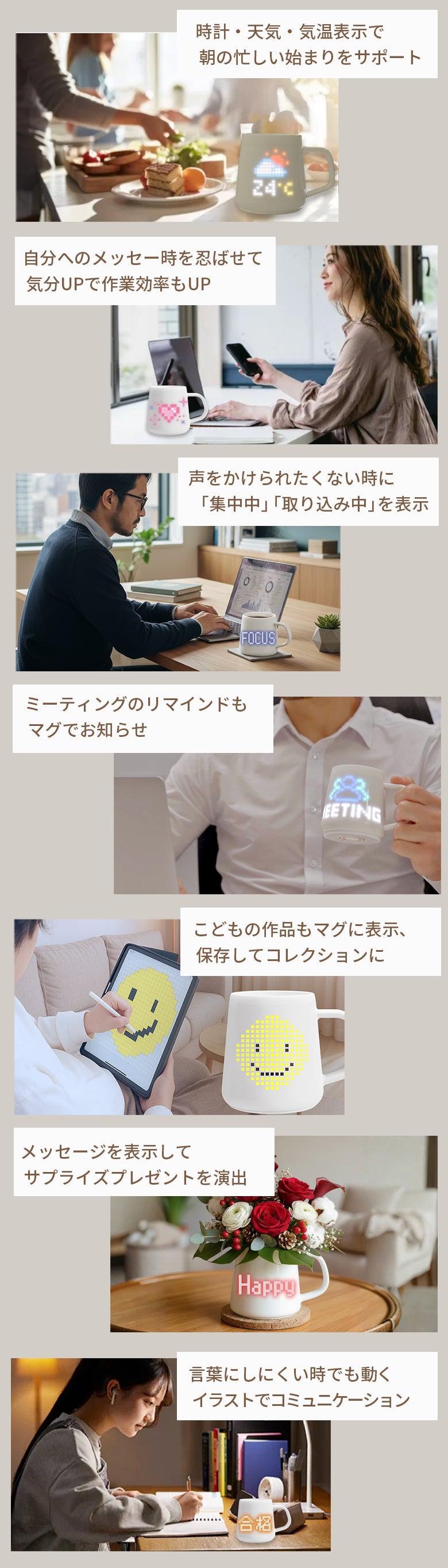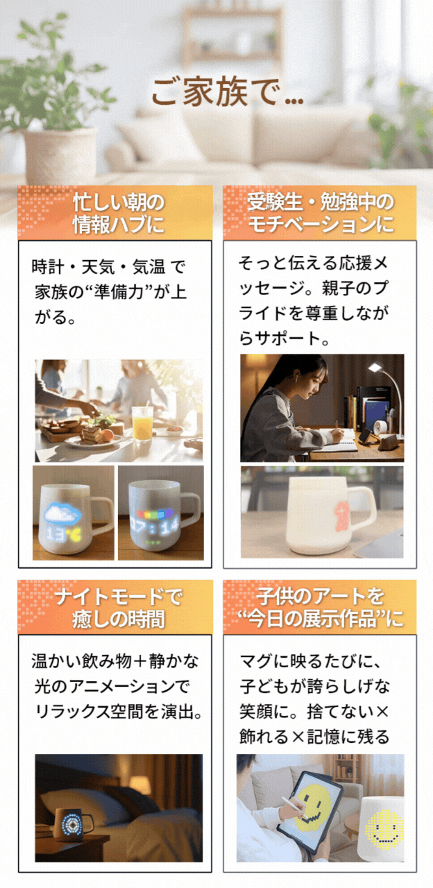 2026/04/09 12:34新生活で離れてしまった家族に、温まるメッセージを送ってみませんか?LINEやメールでしか今まで気持ちを表現できなかったけど、それ以上の温かいメッセージとして、光が灯るマグカップで届けてみませんか?社会人で引っ越したお子さん、進学で一人暮らしのお子さん、単身赴任先から自宅へ、など、ふと、デスクやテーブルにあるマグカップに、ふいにメッセージが届いたら、、なんか、ほっとして癒されて、気持ちがグッと上がりますよね!朝、コーヒーを入れていつものように一息つこうとしたときふと、PixelMugに小さくメッセージが表示されました「おはよう」や 可愛いドットアート。それだけの言葉なのになんだか少しだけ、胸があたたかくなる。送ってくれたんだ!っていう LINEとは違ったこの気持ち。スマホでやりとりするのとは違って“ふと目に入る”この感じ言葉というより気配が届くような感覚離れて暮らしていてもちゃんと繋がっているんだなって思えるこの感覚。PixelMugは便利な機能もたくさんあるのですがこういう何気ない瞬間を少しやさしくしてくれるものなんだと感じる。もし大切な人が遠くにいる方はこの感覚、きっと共感していただけると思います。 もっと見る