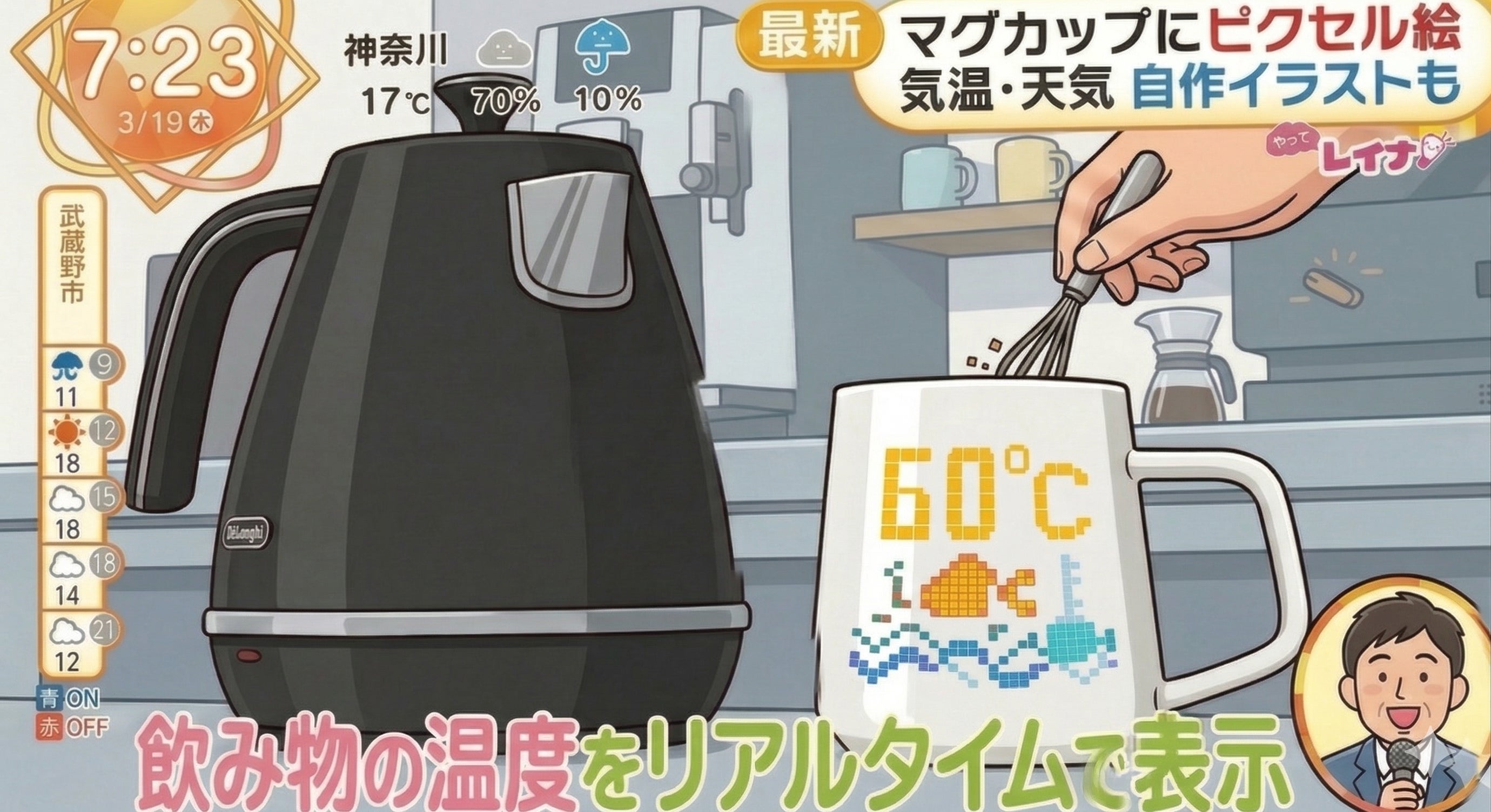 リアルタイム飲み物温度表示で、飲み頃がわかり、世界時計、天気と気温を表示する優れもの。さらにはミニゲームまで搭載した多機能性。