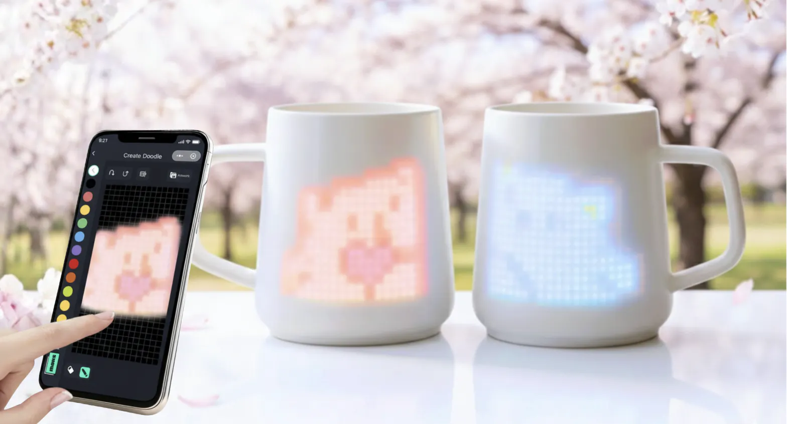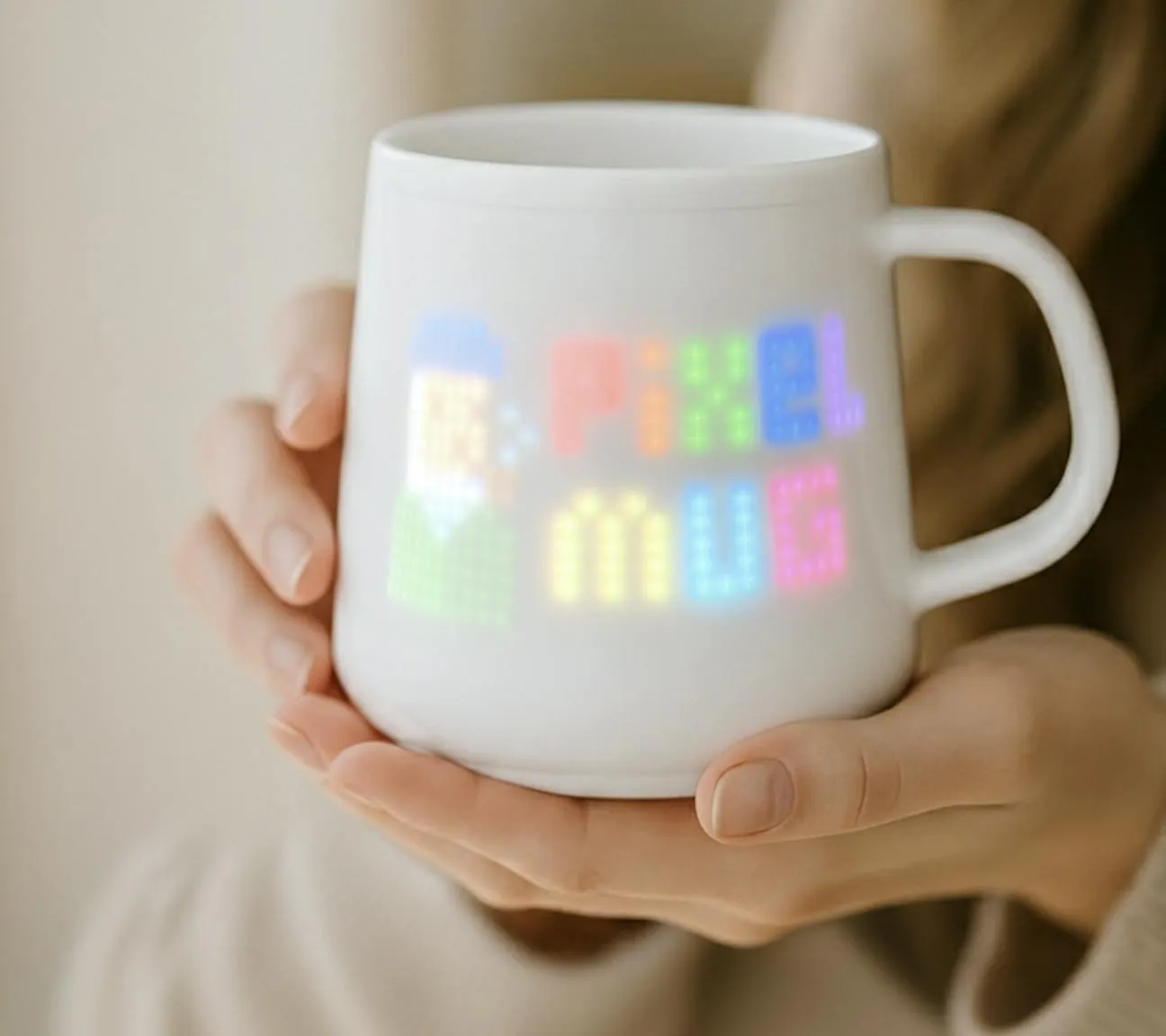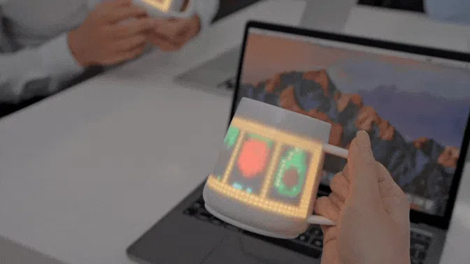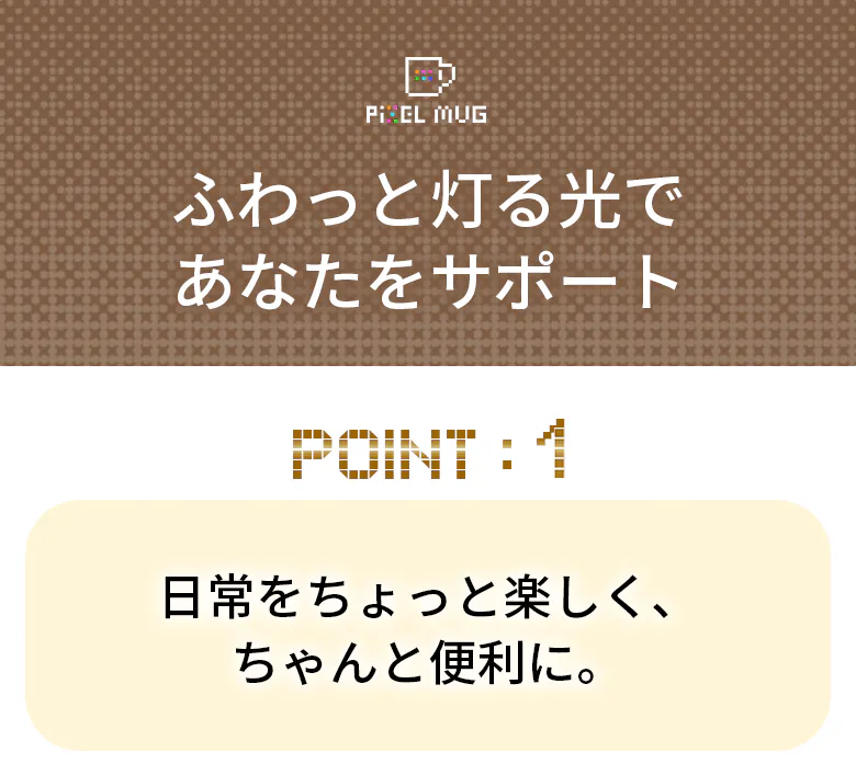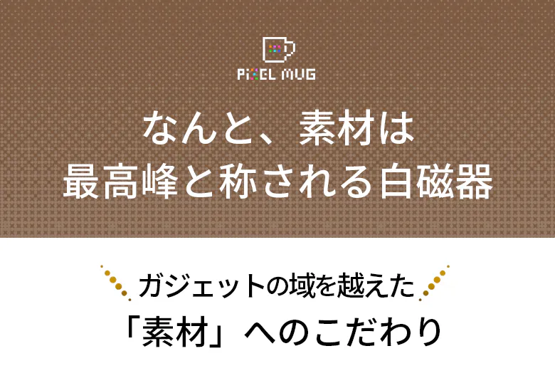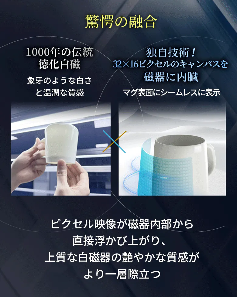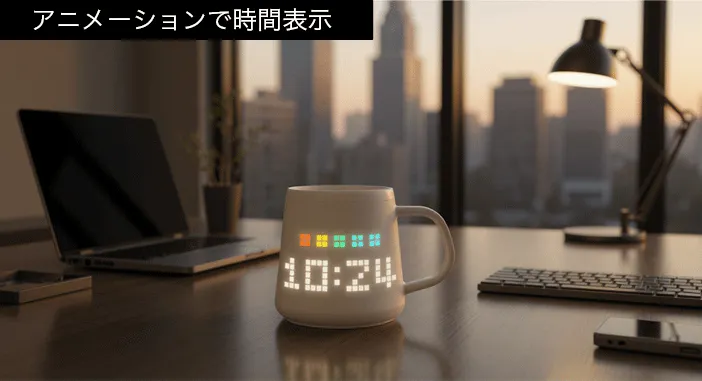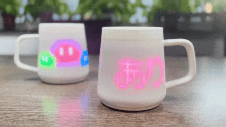 ダイナミックなピクセルアートがマグの表面で光り、躍動します。
