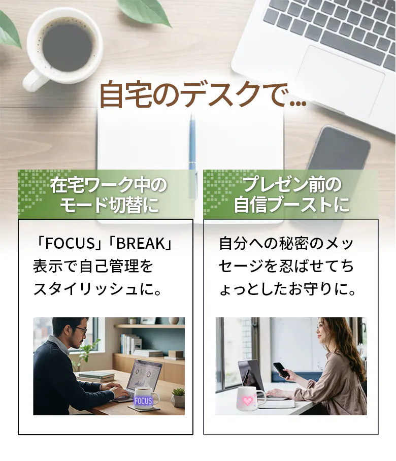 表面のシームレスなタッチセンサーを指で操作をすると表示が瞬時に切り替わります。スマホアプリでは新しい文字メッセージやオリジナルアートを作成してマグに送信。会議中や作業中でもスマホを取り出さず確認できます。
