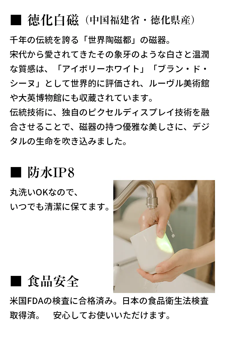 2026/03/21 09:31もう少しで 目標金額達成です!!いち早く支援してくださったかた、本当にありがとうございます!実は、、このPixelMugはただの 面白いガジェットマグカップじゃないんです!こ美しい素材 白い磁器は・・・なんと、ルーヴル美術館、大英博物館、メトロポリタン美術館などで高く評価されているすごい素材なんです!徳化白磁と言って象牙のような温かみのある白色と、半透明で滑らかな器肌が特徴です。さらに、、、PixelMugは2025年9月 中国(香港、マカオ、台湾)、ドイツ、フランス、イタリア、イギリス、日本、シンガポールを含む世界23の国と地域から5,669点の応募から3回に及ぶ厳正な審査を経て、徳化白磁の伝統素材の「職人技と革新性」が高く評価されみごと! 金賞 に選出されたんです!!PixelMugは インテリアをさらにグレードアップさせてくれる、最先端の技術の逸品ですかわいい光のピクセルが 上質な白磁から綺麗に灯る、天気や時間、飲み物温度も表示してくれるから操作しない時でも光でいつでもインテリアを格上げしてくれます。本物をご自宅に。そして、ギフトとしても唯一無二。 もっと見る