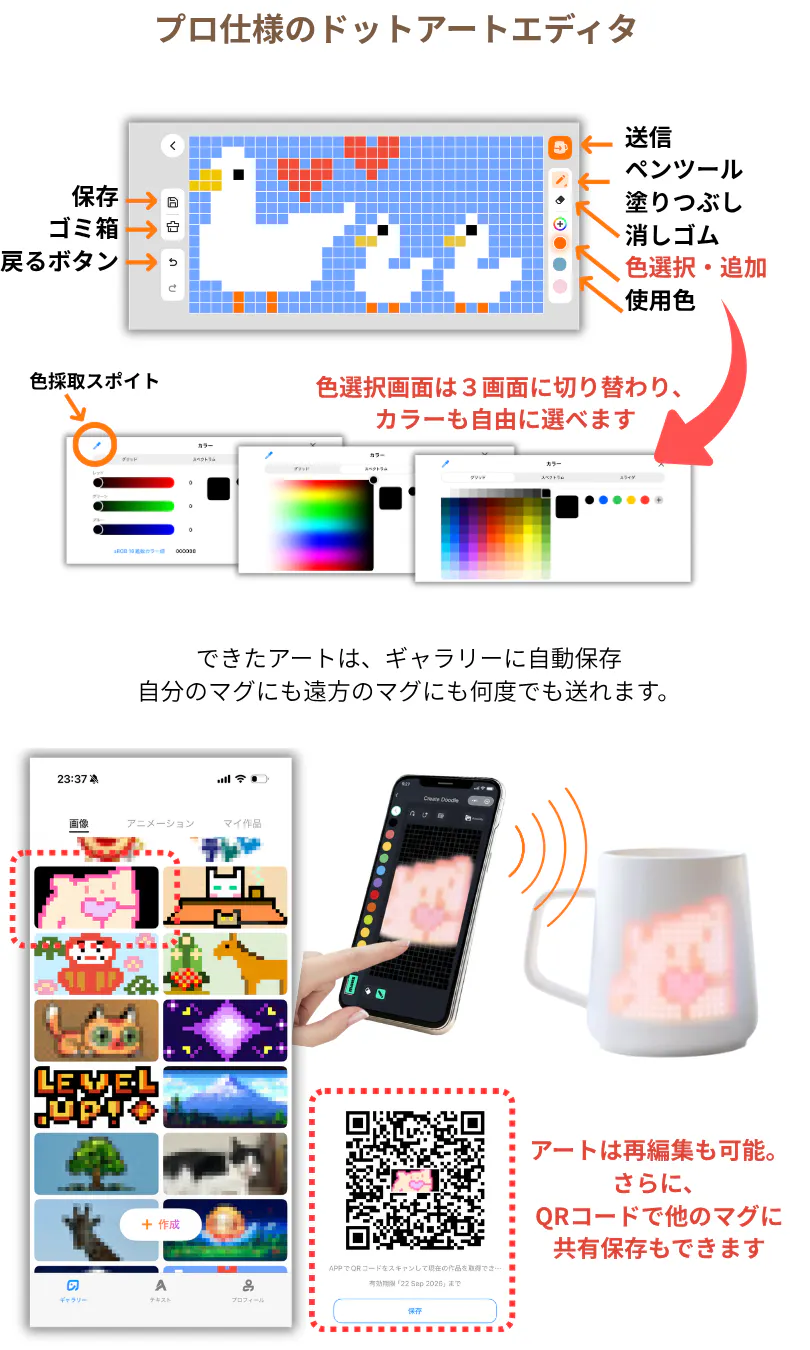 作ったアートは自分のPixelMugや、友達のPixelMugにも送信でき、自動保存されます。