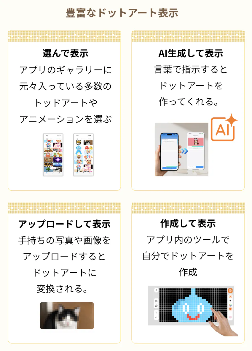 ドットアートの表示は4つの方法のどれからでも選んで簡単に表示できます。