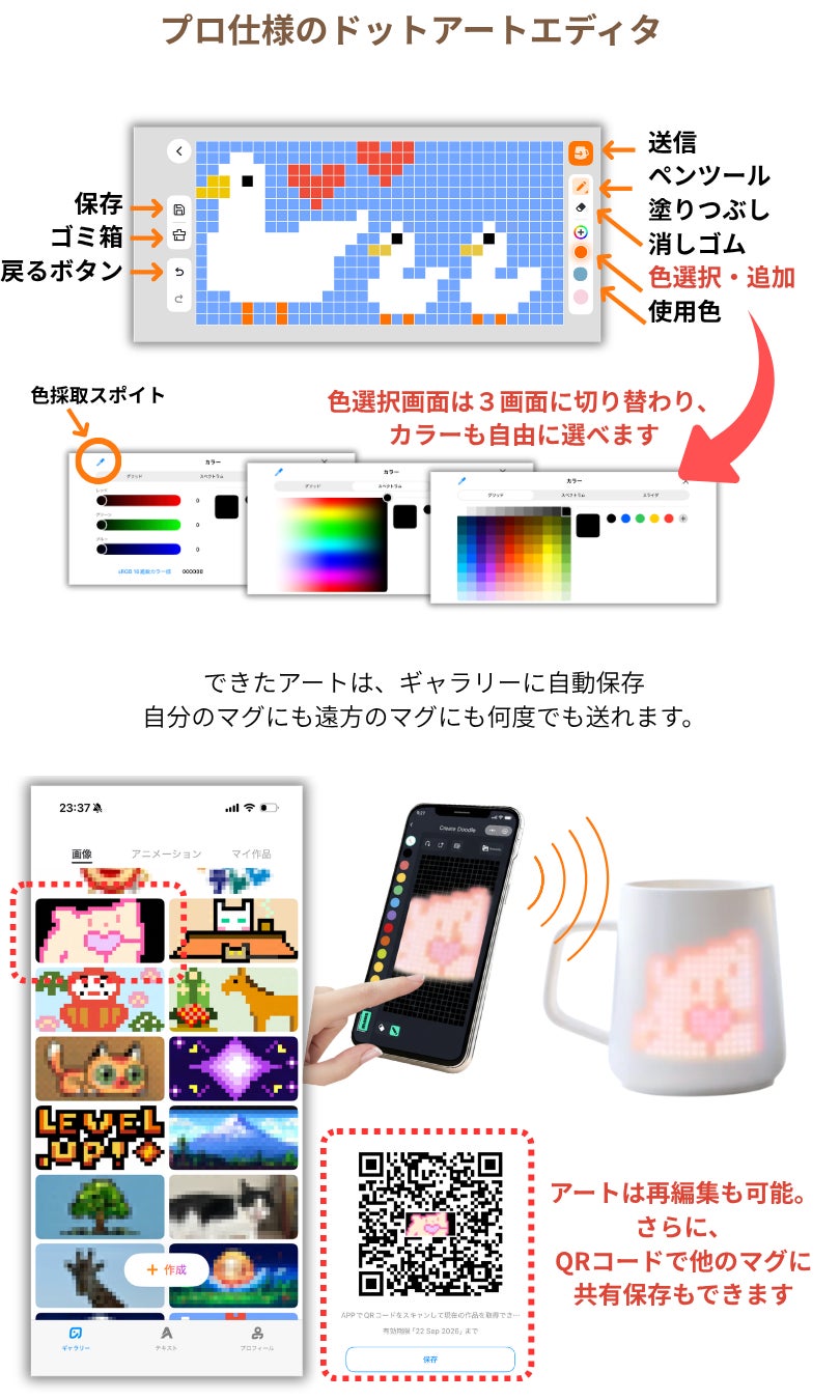 作ったアートは自分のPixelMugや、友達のPixelMugにも送信でき、自動保存されます。