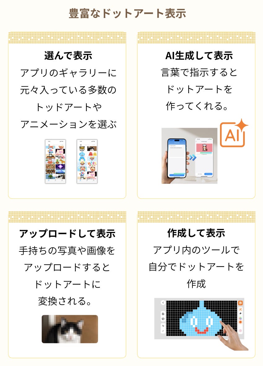 ドットアートの表示は4つの方法のどれからでも選んで簡単に表示できます。