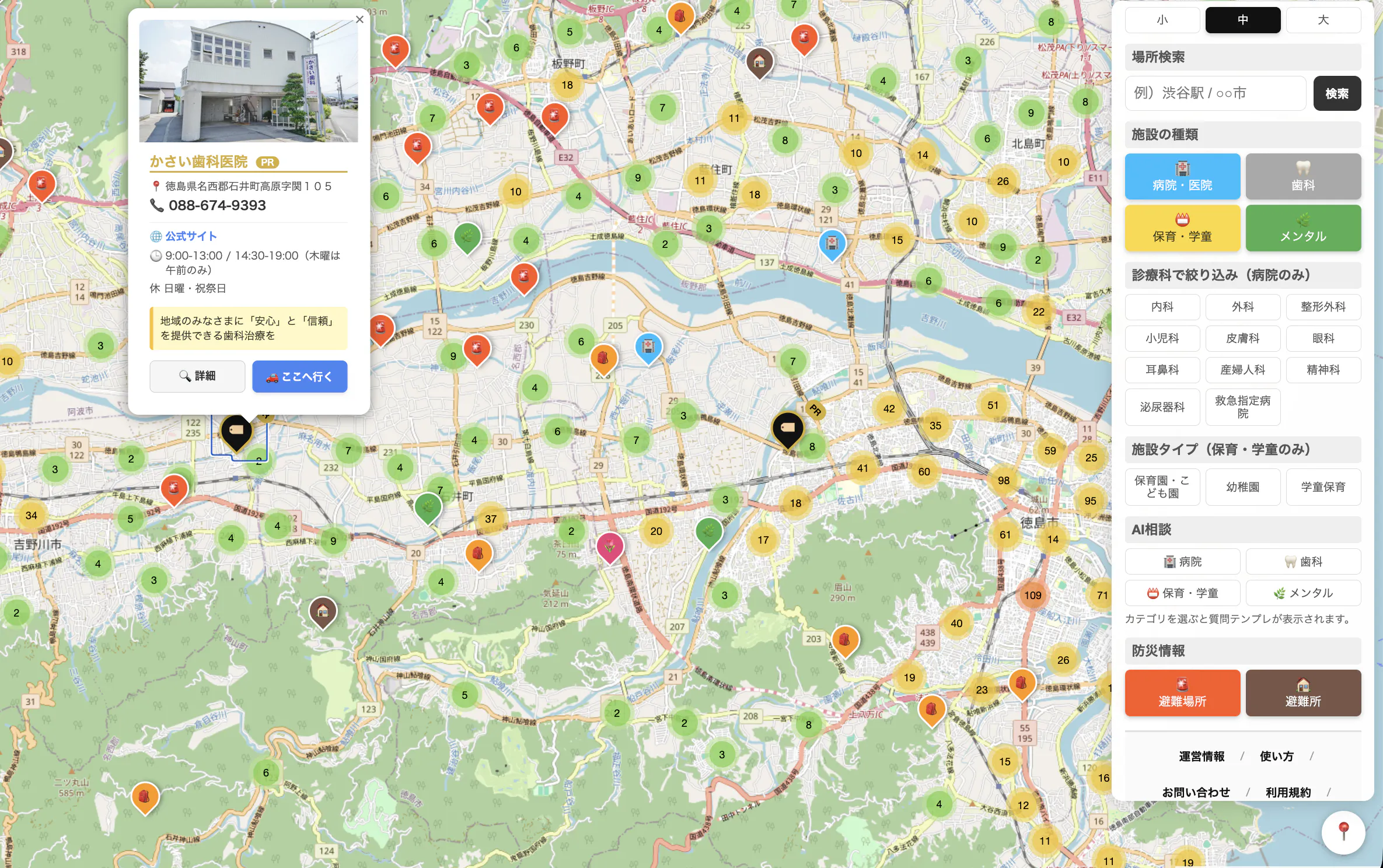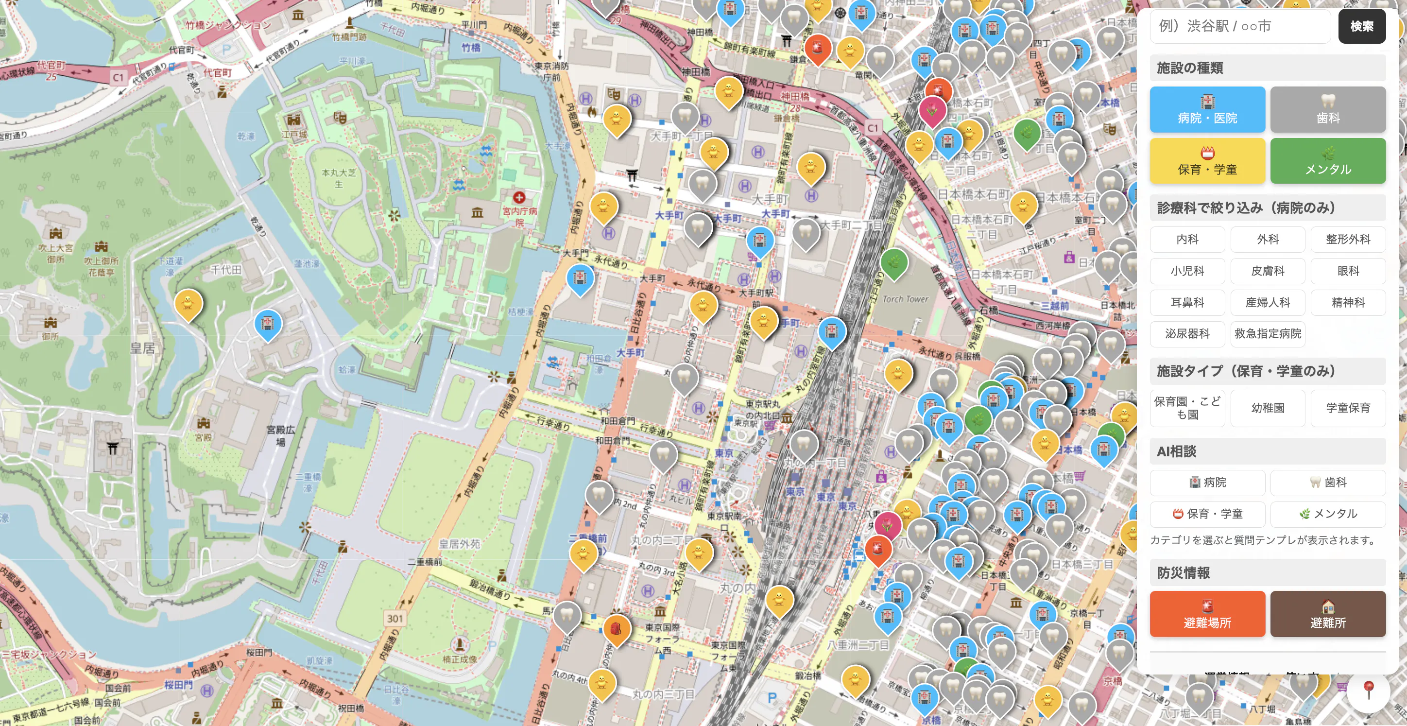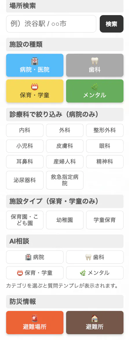• 🏥 病院/歯科/保育/メンタル/避難所を地図で探せます