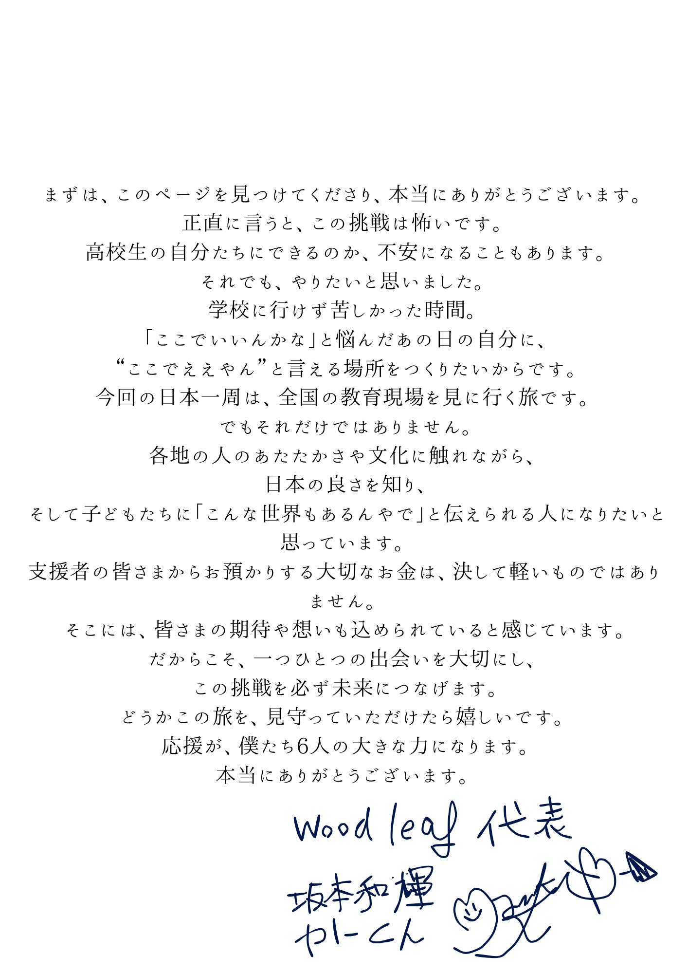 「Wood leaf(小さな葉)」という名前の通り、今はまだ小さな一枚の葉に過ぎない僕ですが、応援してくださる皆さんの力を借りて、いつか誰かを守れるような大きな木へと成長したい。