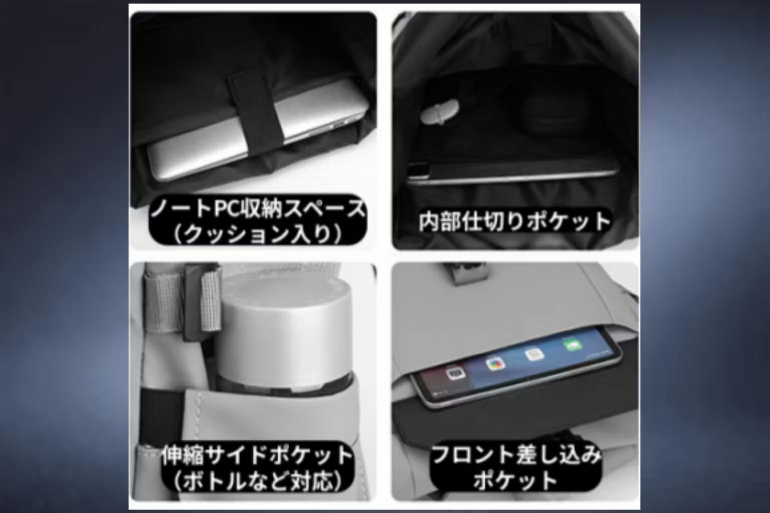 内側にはノートPC専用のクッションポケット、前面・側面にはすぐ取り出せる多機能ポケットを搭載。