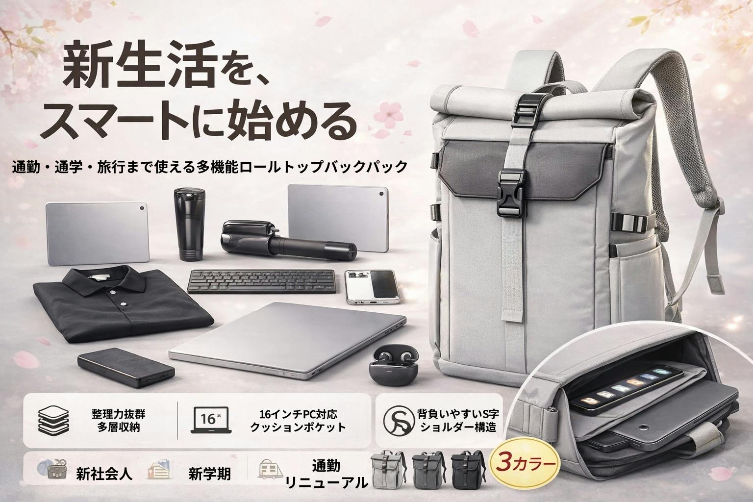 ・大容量 × ロールトップ拡張:47cmまで拡張し収納力アップ