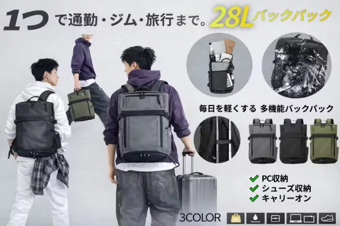 ①通勤・ジム・旅行、これ1つ。 28L大容量で毎日を軽くする多機能バックパック