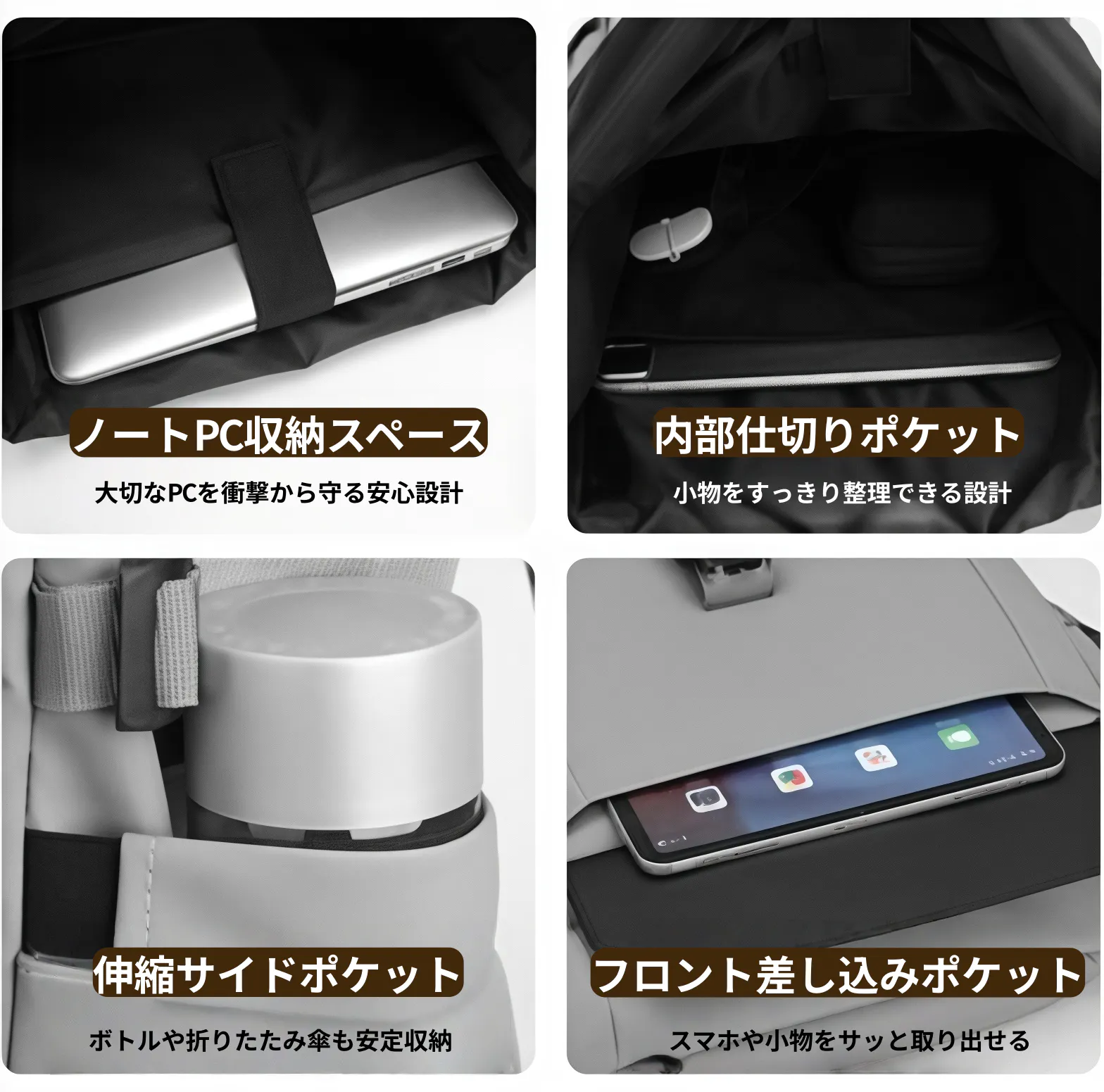 ・PCも安心収納・小物は迷わない・ボトルも安定・すぐ取り出せるポケット