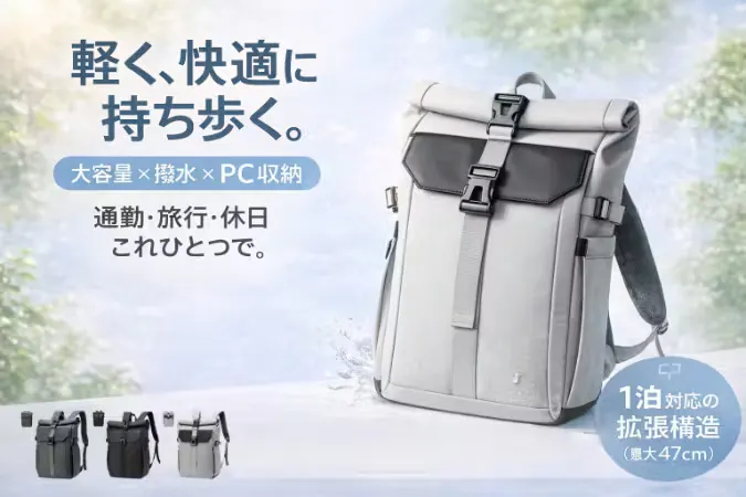 雨の日でも安心の撥水素材を使用し、通勤や通学だけでなく、1泊旅行・アウトドアでも活躍します。