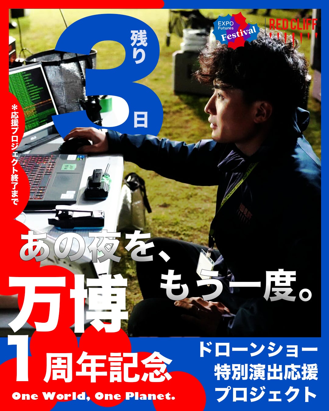 あの「One World, One Planet.」のドローンショーを、一夜限りの進化版として蘇らせます。